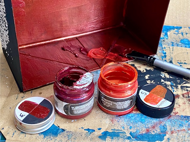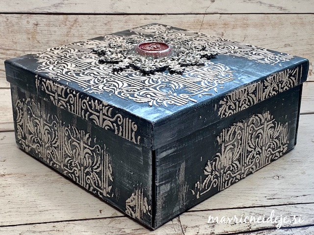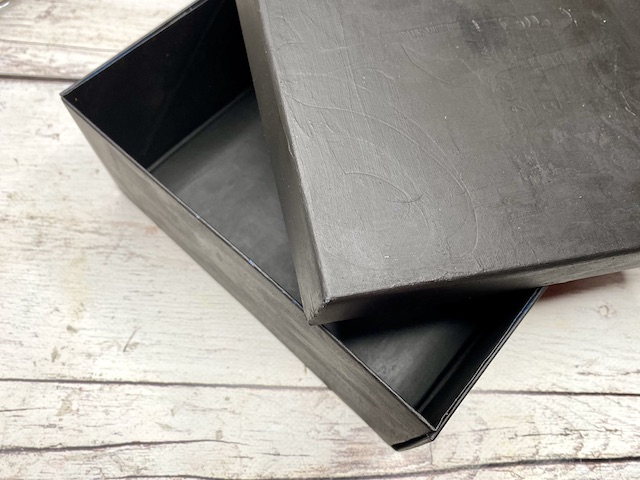 Na veliko čvrsto škatlo iz papirja sem najprej nanesla črn gesso premaz. Tako sem poenotila različne površine, saj je bila škatla potiskana z gladkim in mat potiskom.