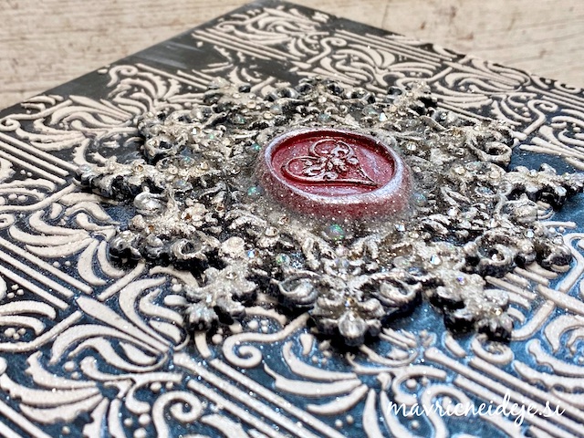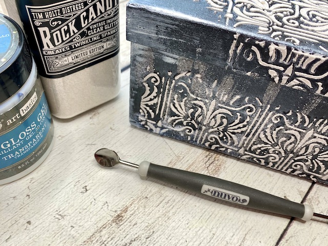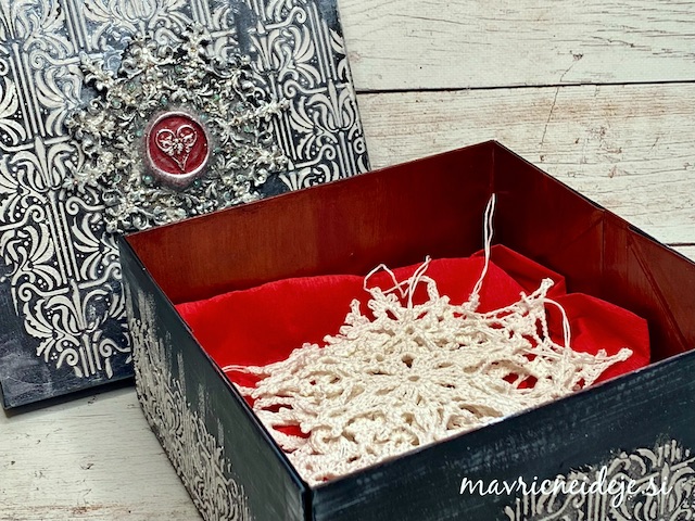 Za lepljenje snežinke na pokrov škatle sem uporabila močno mixed media lepilo.