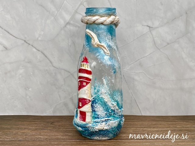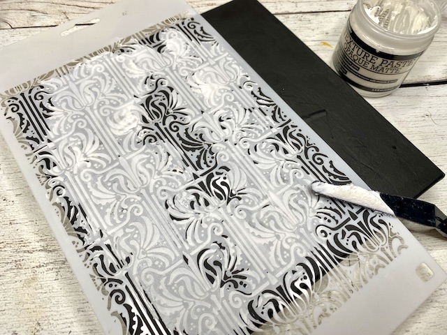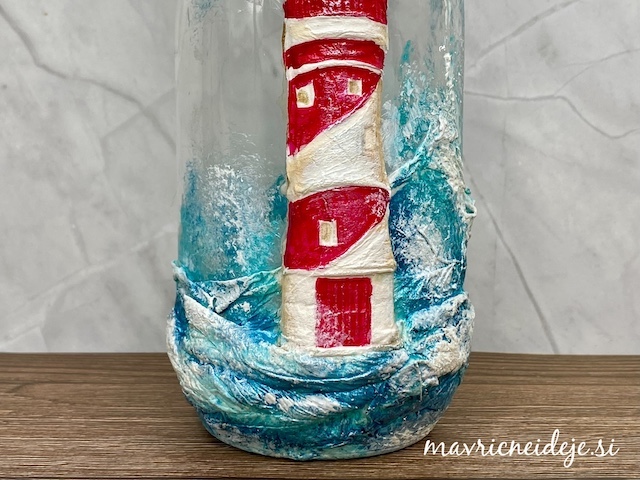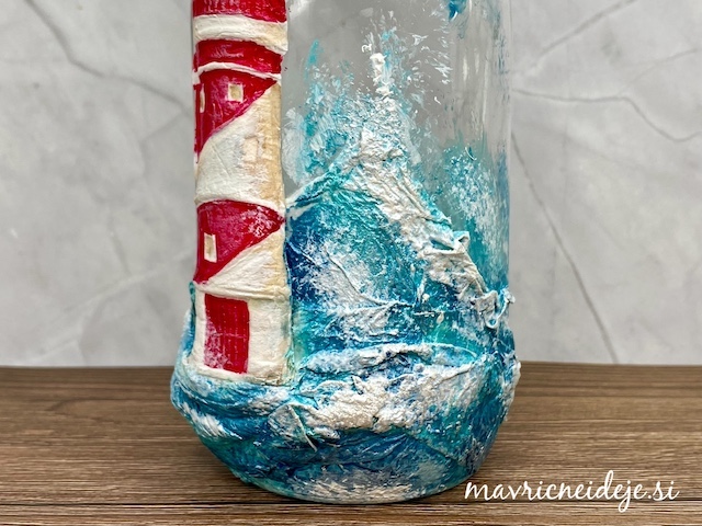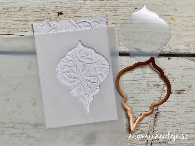 Preko stencil šablone sem na zunanjost nanesla belo teksturno pasto.