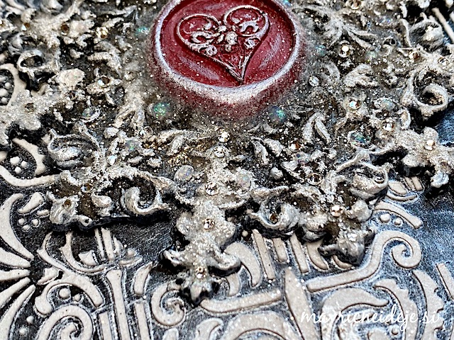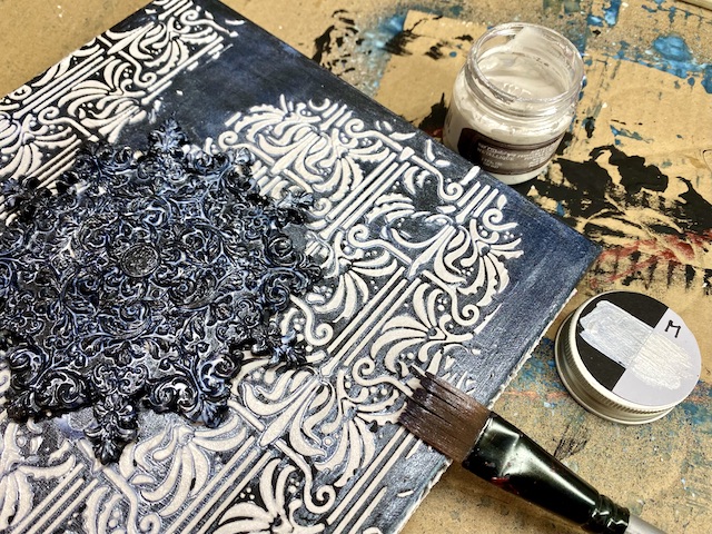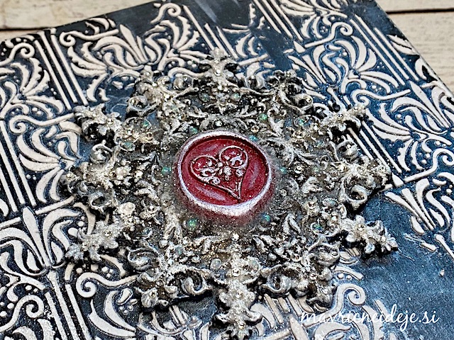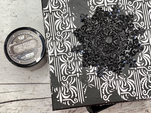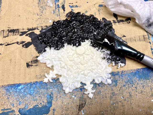 Med sušenjem teksturne paste sem na belo snežinko (ulitek iz smole) nanesla črn gesso.