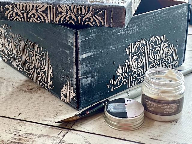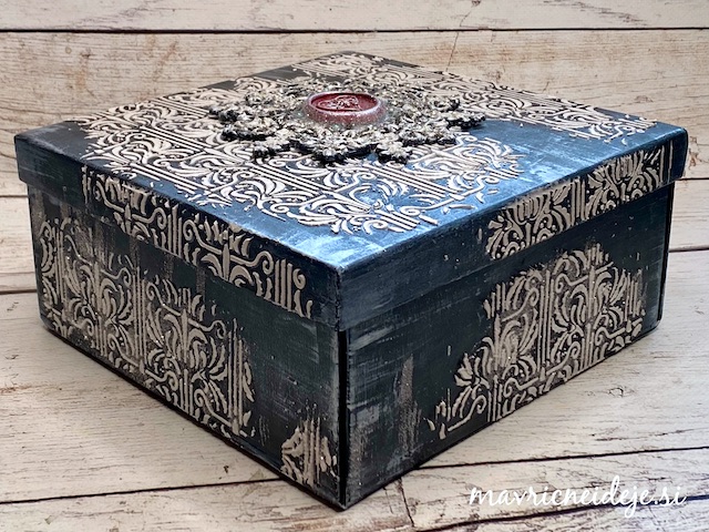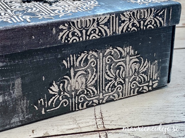 Zunanjost škatle sem najprej pobarvala z res močno razredčemo belo perl akrilno barvo, da je dobila nežen kovinski sijaj.