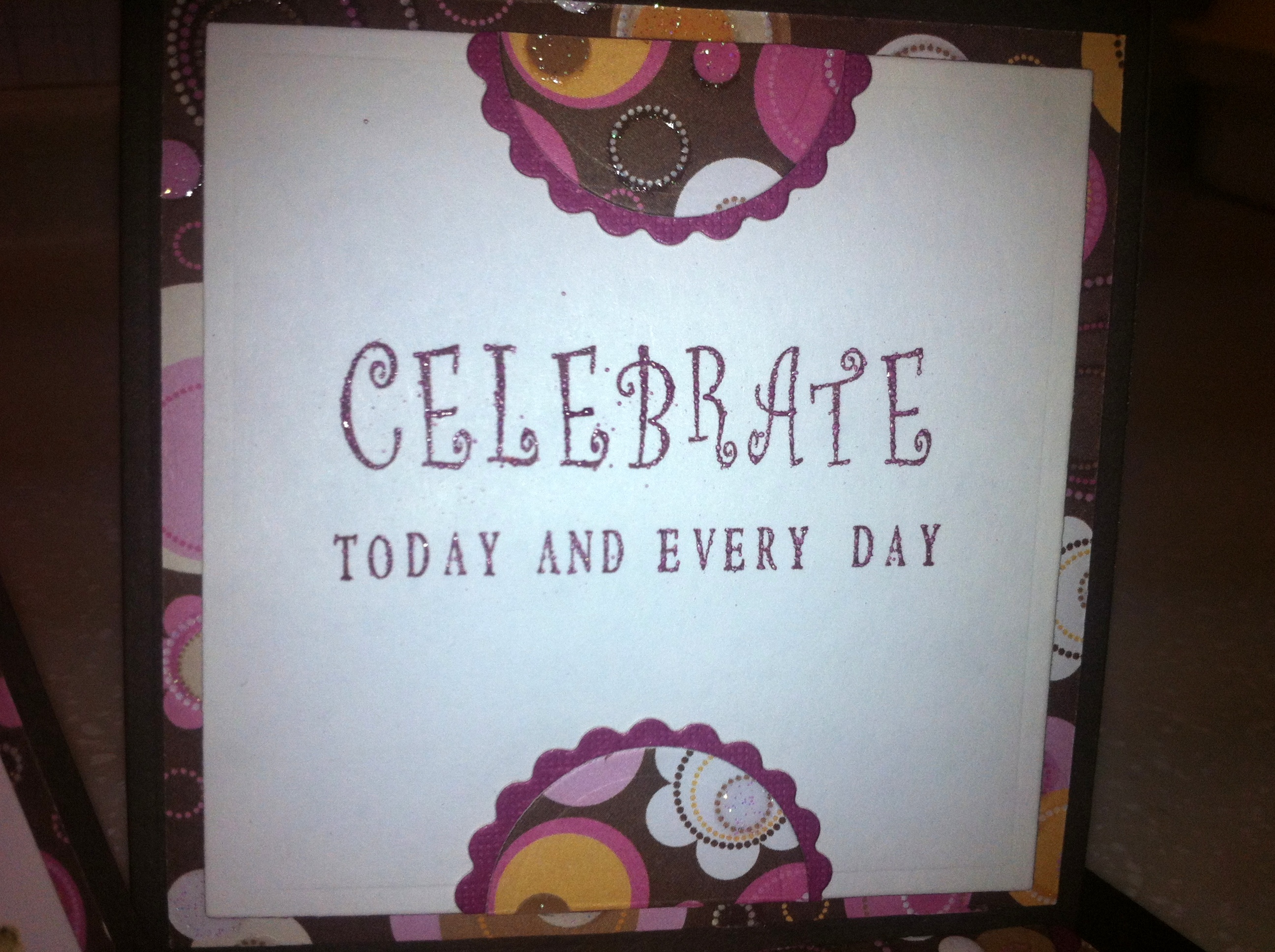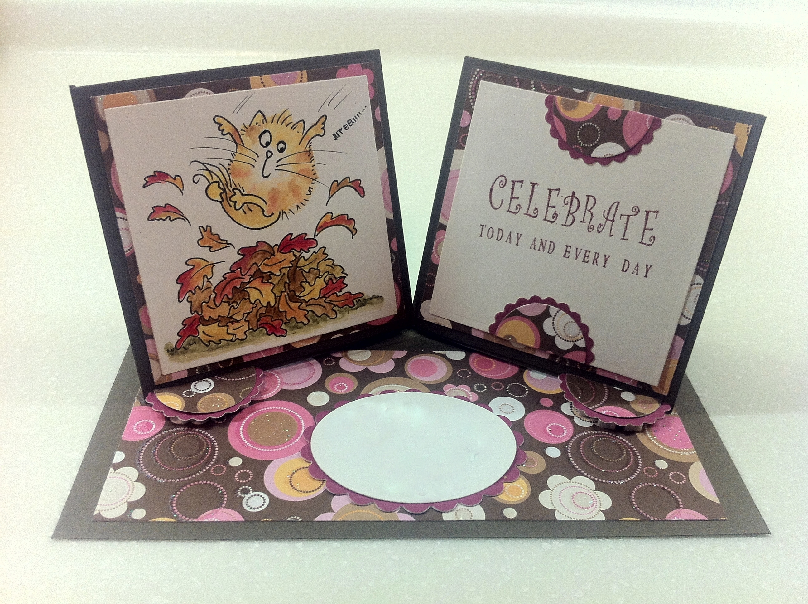 Idejo za to voščilnico sem našla na spletu, povezave žal nimam. Osnova je rjav papir, nato dekorativni papir z bleščicami. Mačko sem narisala po vzoru štampiljke in jo pobarvala z Derwent inktense barvicami.