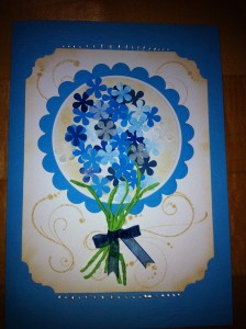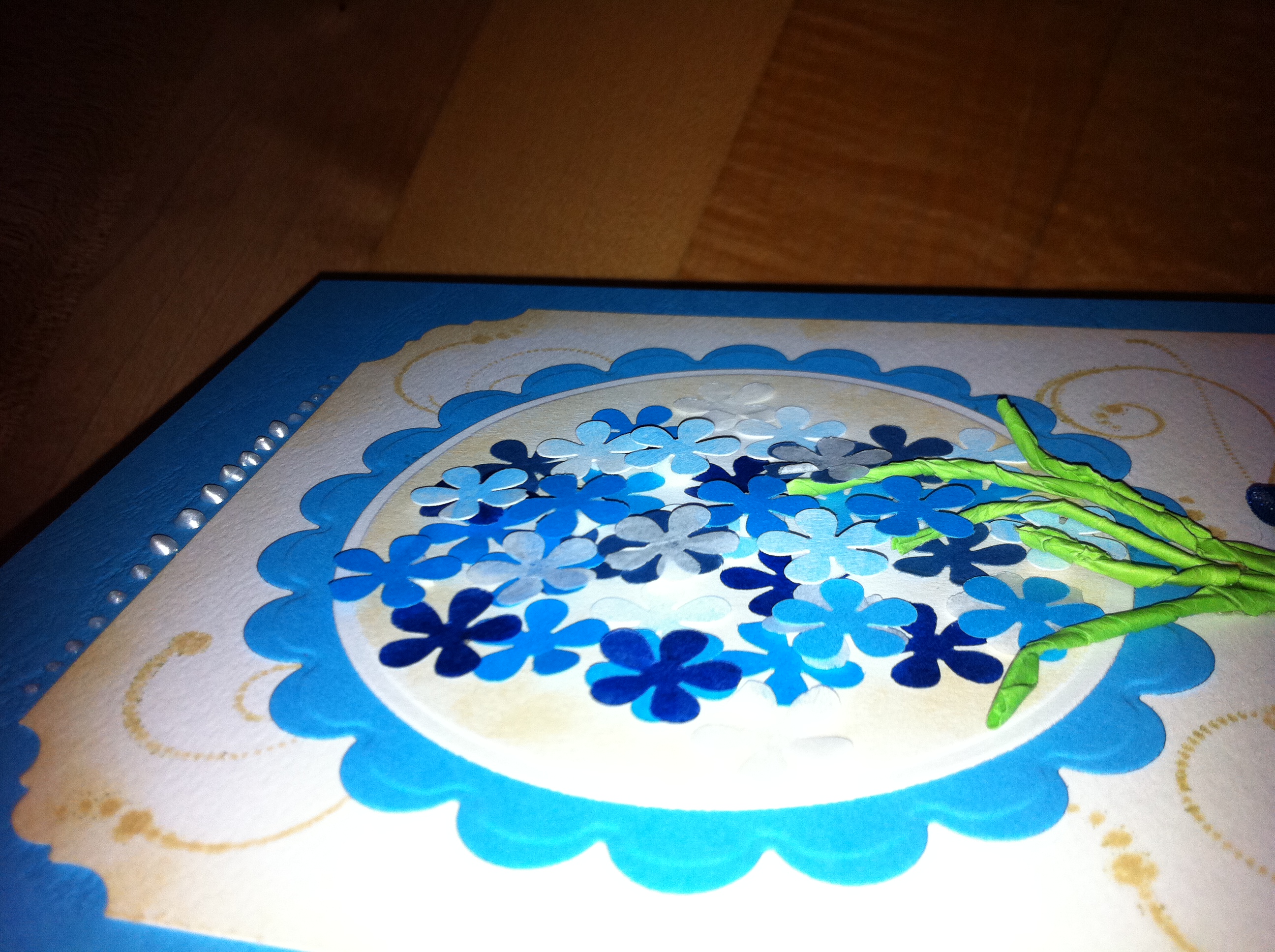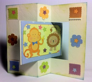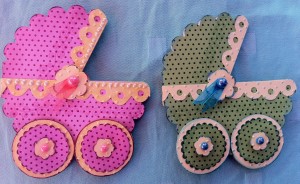 S pomočjo Spellbinders šablon sem izrezala ustrezne kroge in jih sestavila v voziček, ki se v voščilnico odpre tam, kjer bi moral biti še ročaj ;))