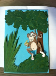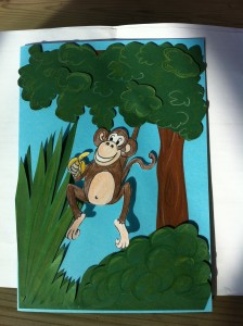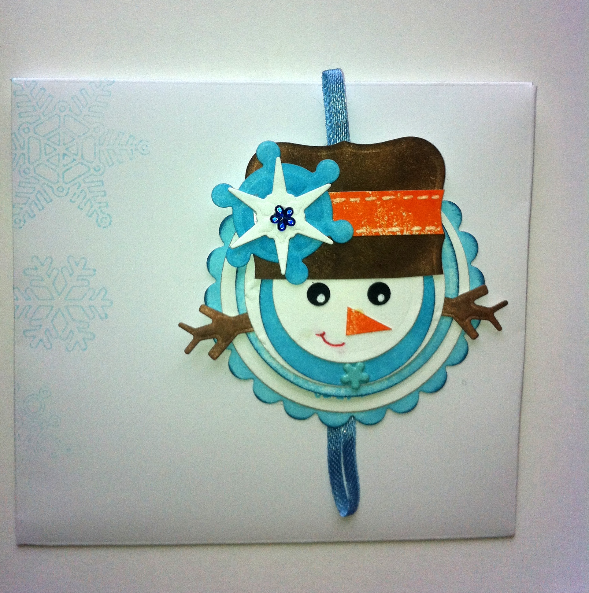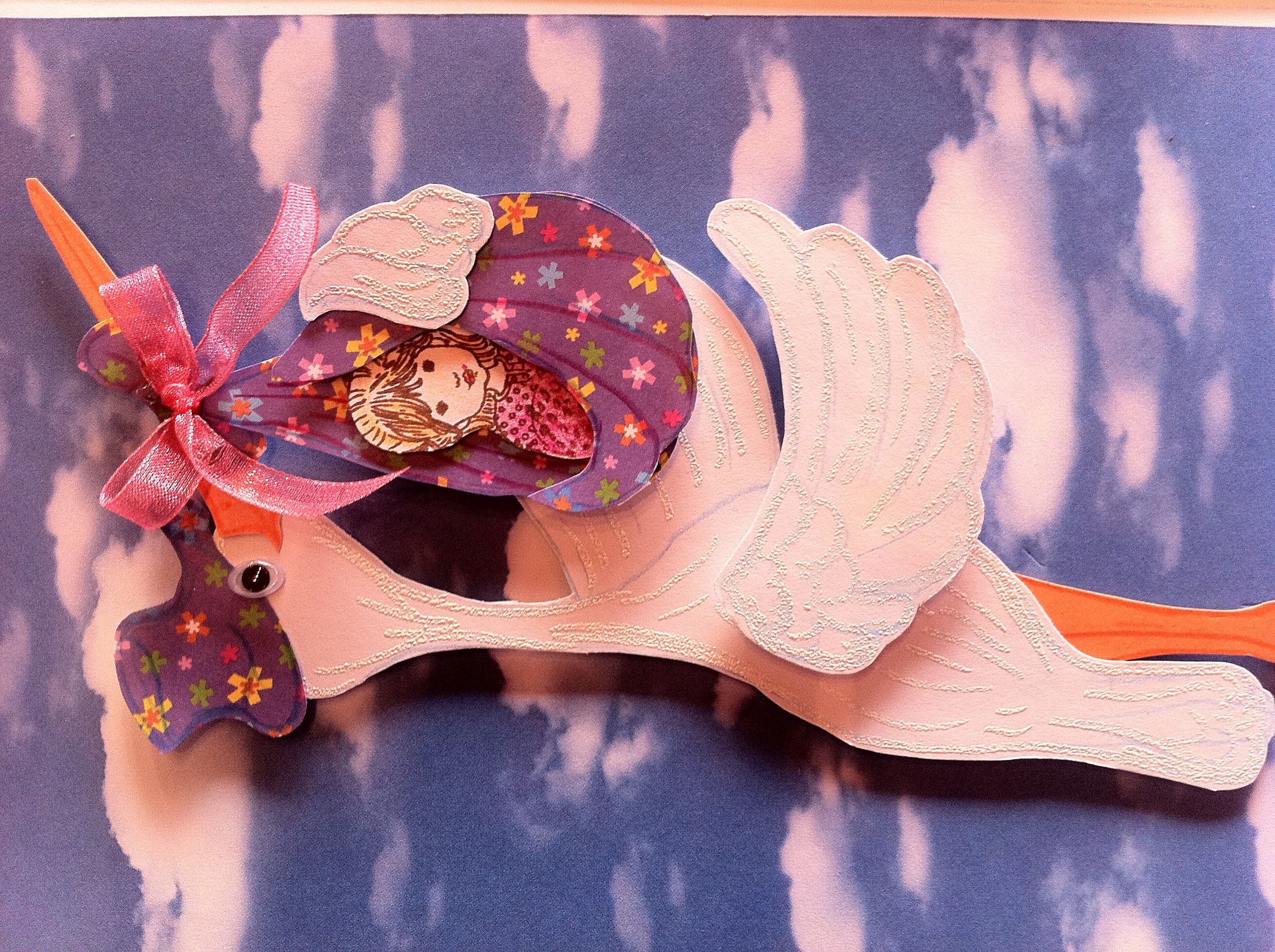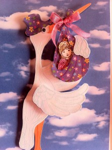 Za ozadje te voščilnice sem izbrala že potiskan papir. Štorkljo sem ročno narisala in izrezala iz belega tršega papirja in peresa embosirala z belim prahom. Dojenčico sem odtisnila na bel papir in jo pobarvala. Vse sem setavila s 3D lepilnimi kvadratki.