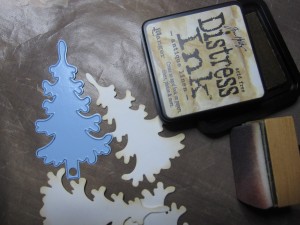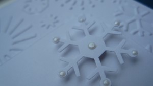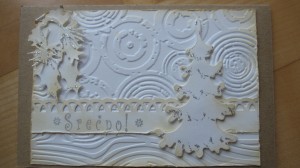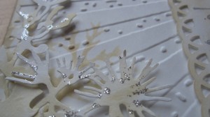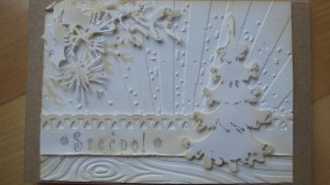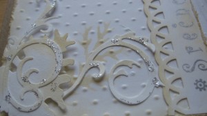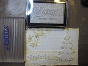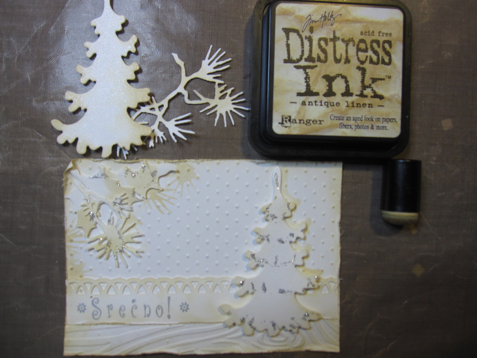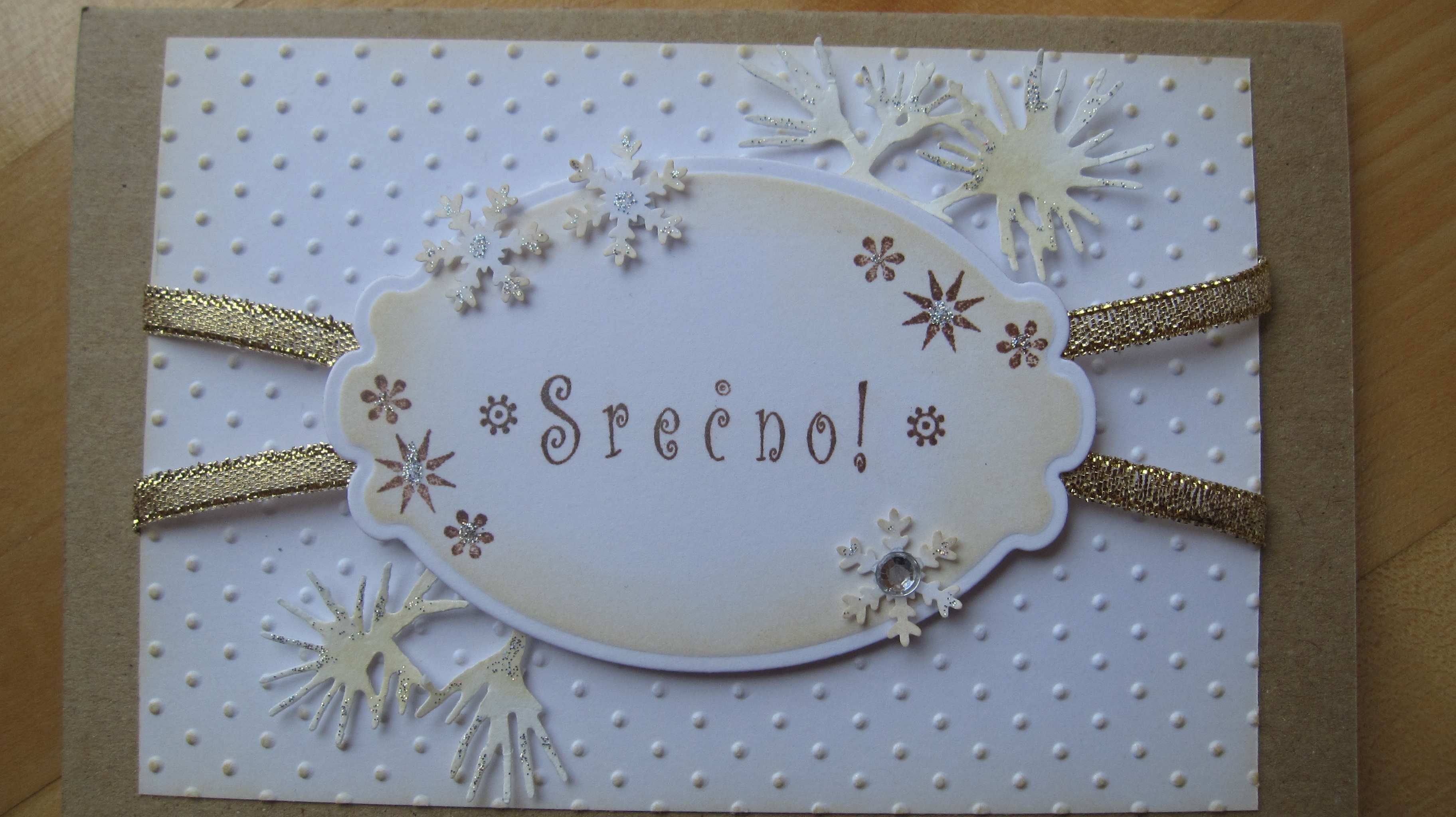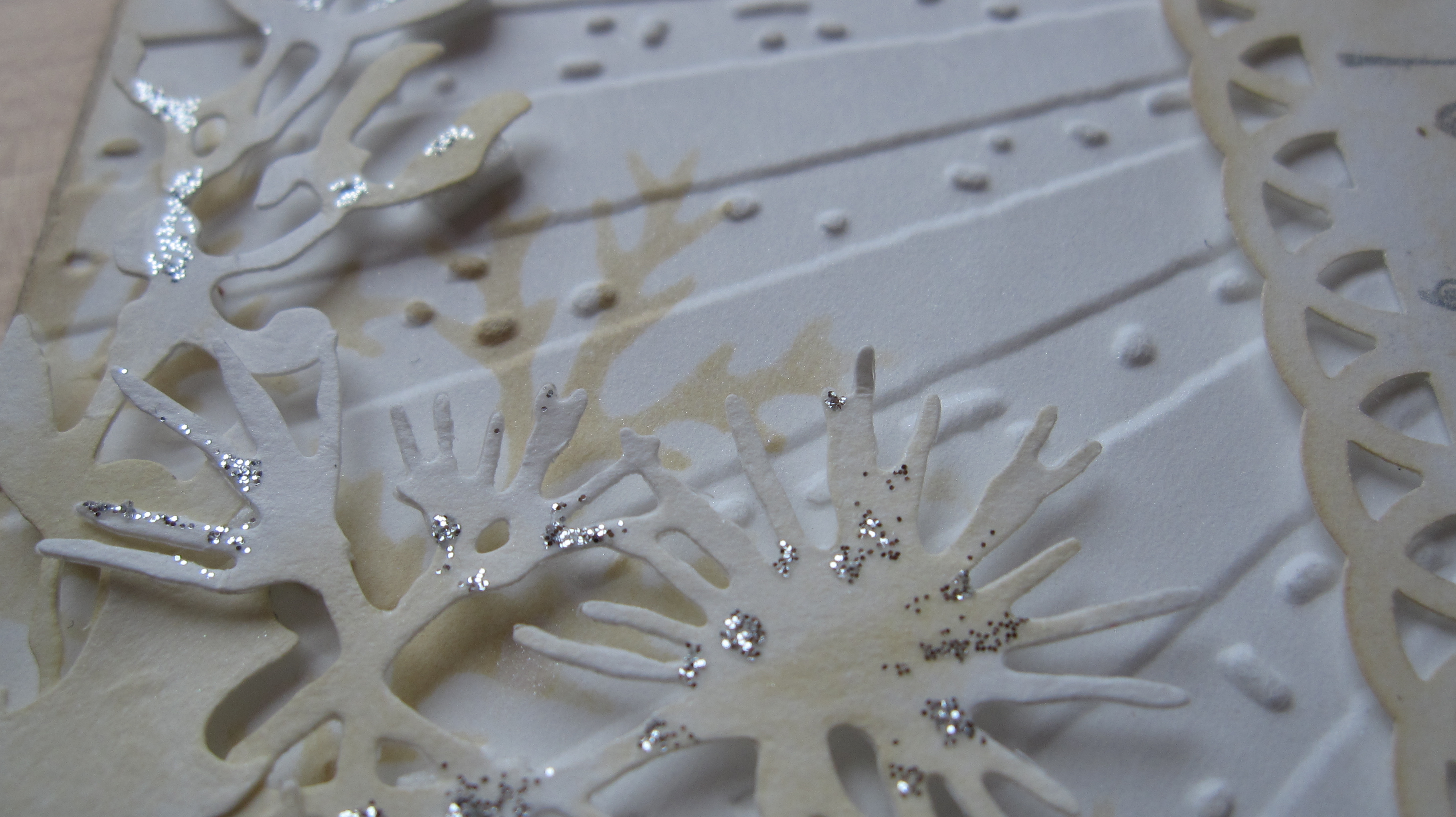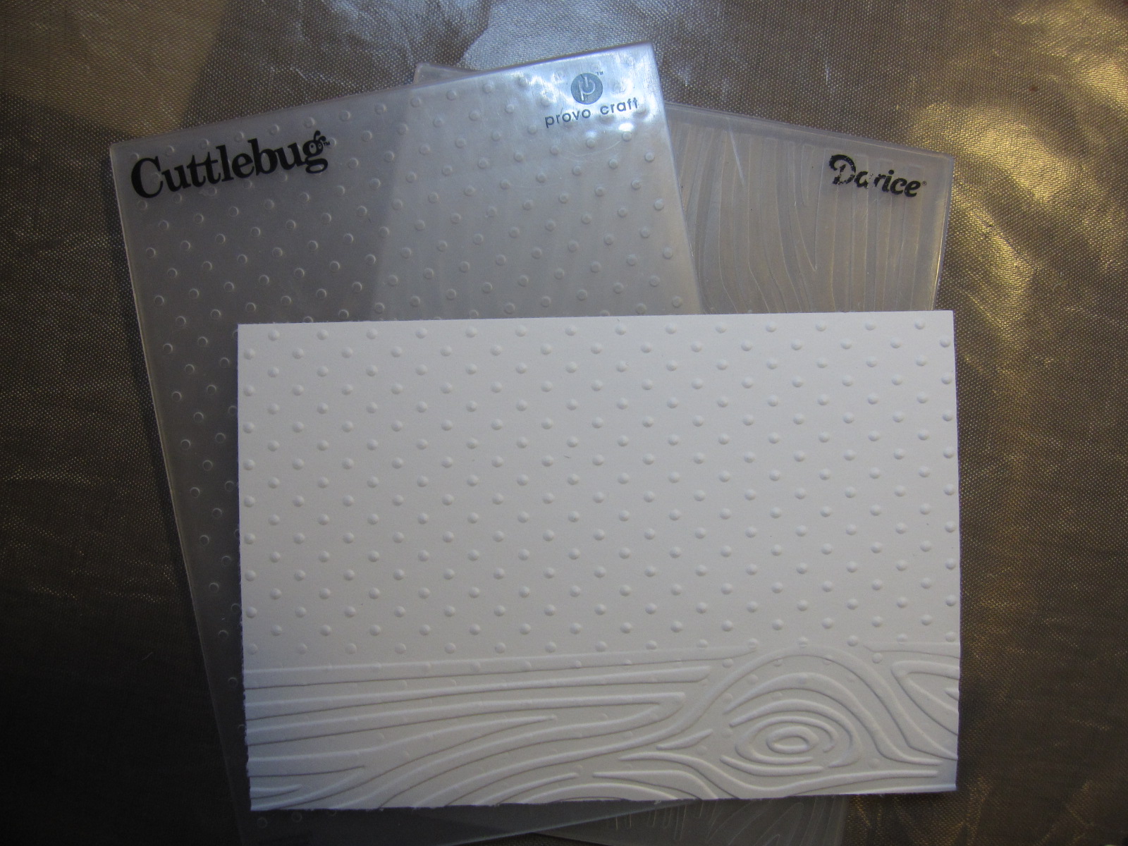 Suho embosiranje s Sizzix Big shot napravo in embosirnimi srajčkami. Uporabila sem malo debelejši papir, zato sem ga pred embosiranjem navlažila z vodno meglico s pomočjo Ranger mini mister razpršilca.