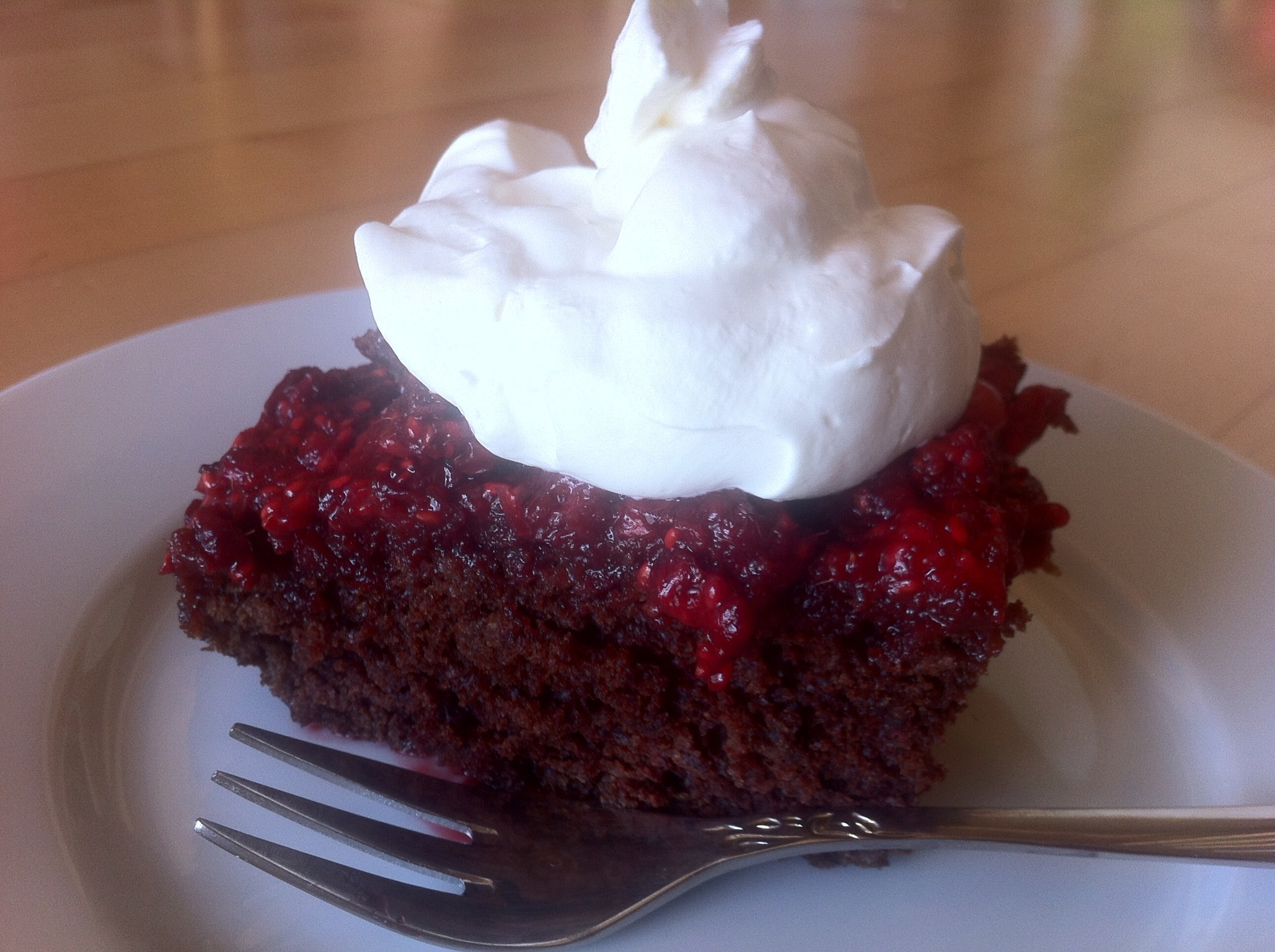 Na pečen biskvit sem polila na hitro pokuhane domače maline in ribez. Postregla sem s stepeno smetano.