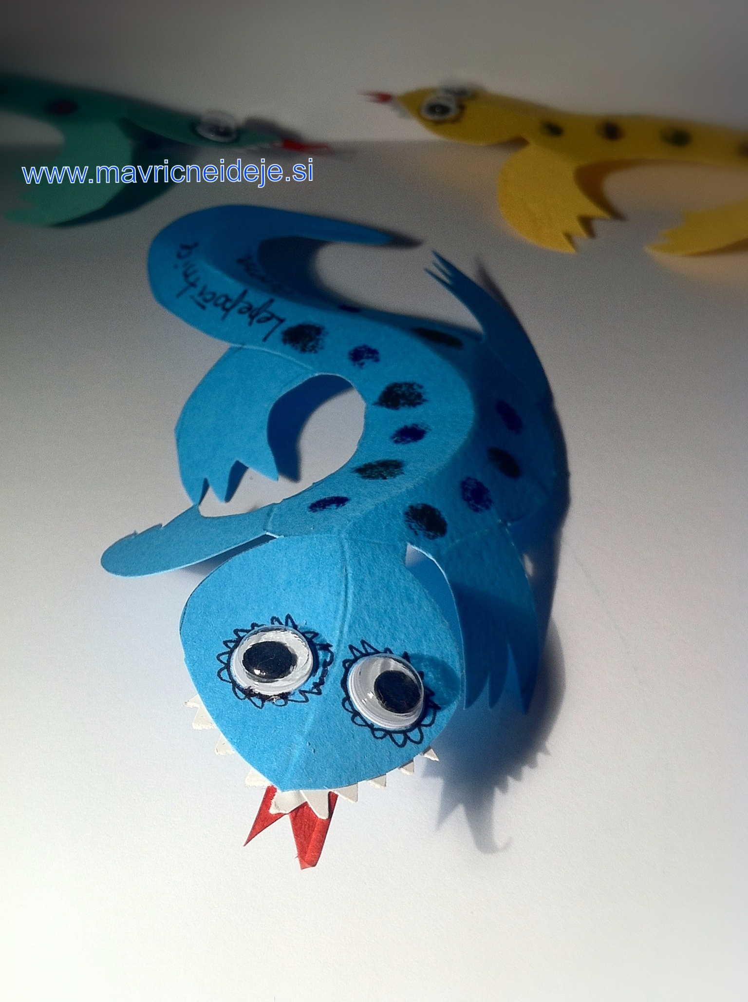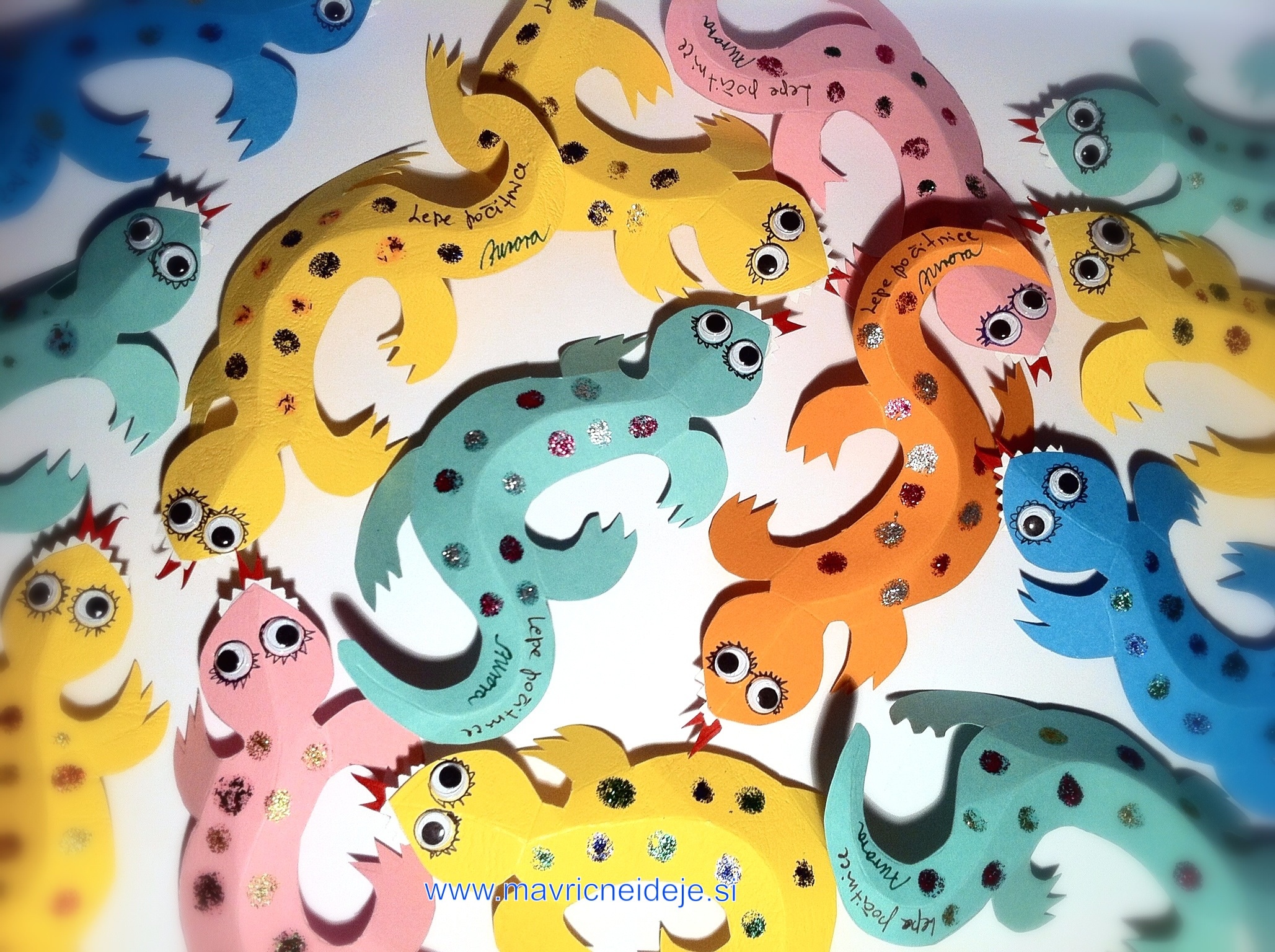 Med brskanjem po spletu sem naletela na prav prikupne kuščarje. Hčrka jih je potrebovala 30, zato sva izdelavo malce poenostavili. Vseeno so naju od vsega izrezovanja boleli prsti, a se je izplačalo potruditi. Prejemniki so bili navdušeni!