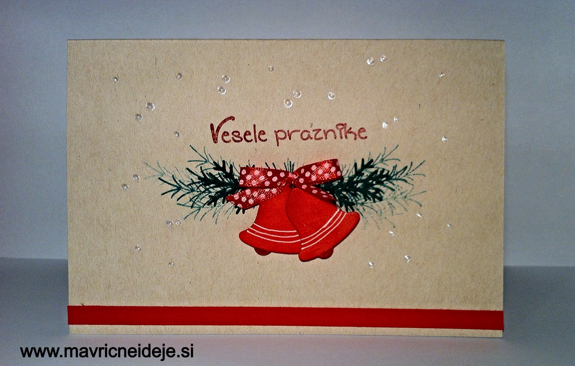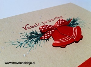 Zvončke sem izrezala iz rdečega papirja in z belim pisalom dorisala črte. Vejice sem večkrat odtisnila in za 3D učinek dodala izrezano vejico. Zvončka sem nalepila s 3d lepilnimi koščki. Za nekaj sijaja sem dodala tekoče perle, ki kot snežinke poplesavajo okrog zvončkov.