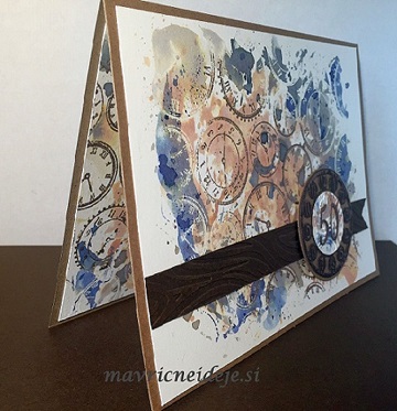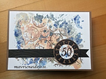 Izdelati voščilnico za moškega, o katerem izveš le to, da bo star 50 let in je bolj poslovne narave je zanimiv izziv. Idejo odtisa ur in akvarelne barve sem našla na spletu, sama pa sem voščilnico izdelala z razpoložljivim materialom iz lastnega ustvarjalnega kotička.