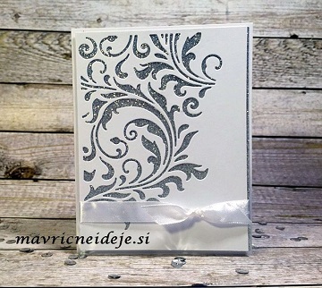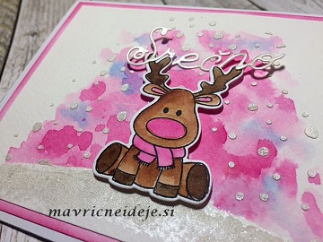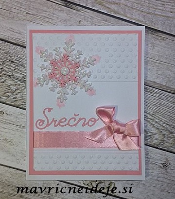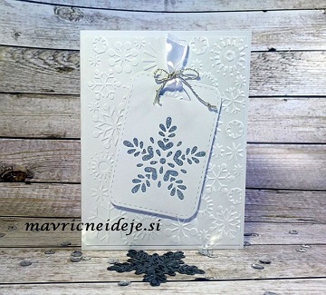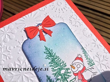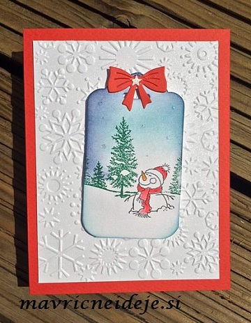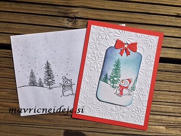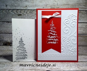 Klasična izbira rdečega in belega kartona obdelanega s tehnikami, ki dajo dober 3d učinek. Suho embosiranje s srajčko, toplo embosiranje belega prahu za sneg na smreki. Na kuverto sem smreko in sneg odtisnila s srebrno blazinico.