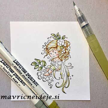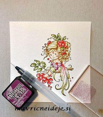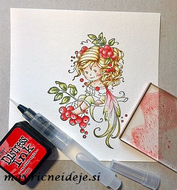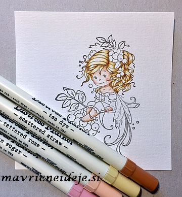 Nadaljujem z uporabo Distress markerjev. Tokrat sem najprej izbrala barve za oblačilo, pobarvala motiv in nato poiskala ustrezen papir iz domače zaloge.