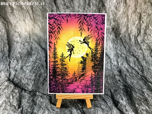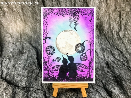Z Oxidi sem pripravila osnovo, jo poškropila z vodo in Perfect pearls. Na vejico sem nanesla Snov Marker, ko nanos sušimo z grelno napravo se ta napihne in nastane pravi videz snega. Vse slupaj sem pobleščala z Wink Of stella markerjem. Dodala sem še par snežink z belim markerjem in Nuvo Dropsi. Napis je rezalna šablona Najlepši par.