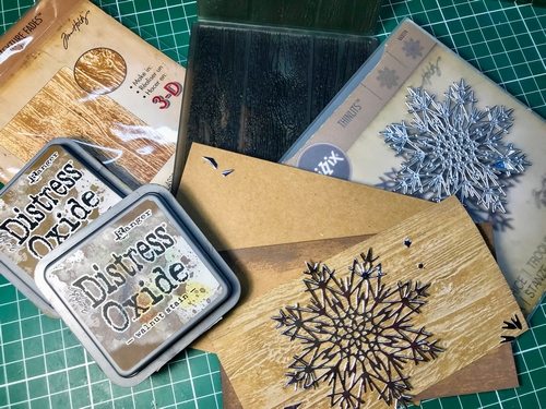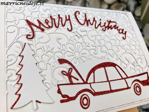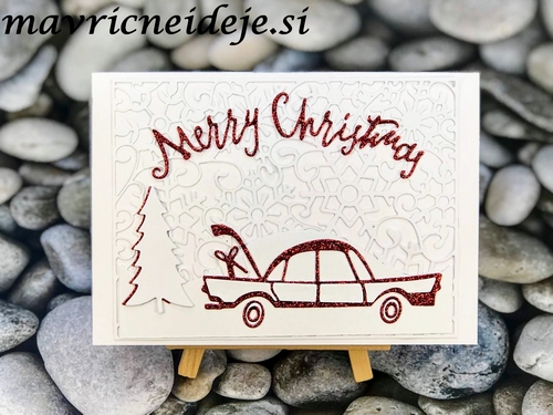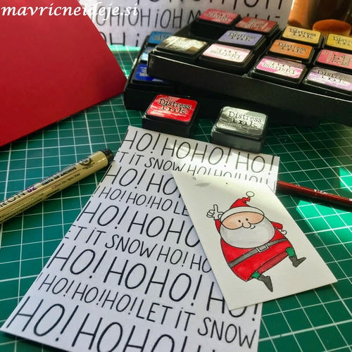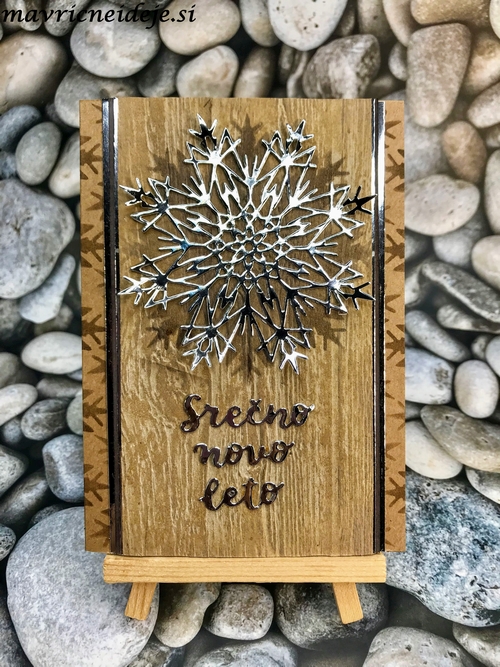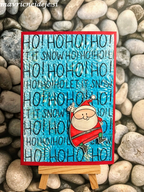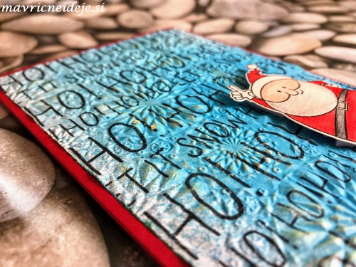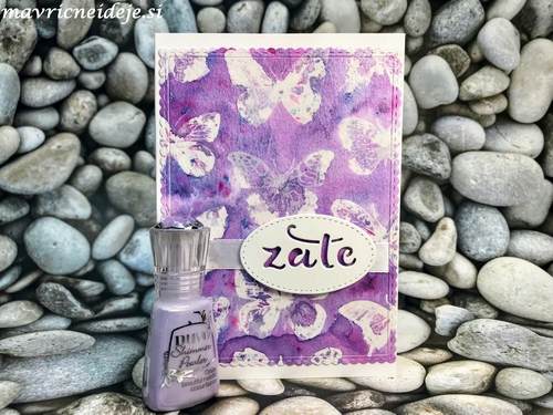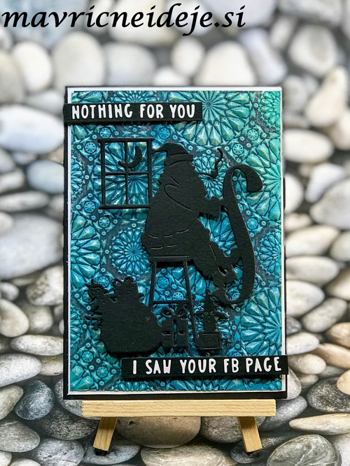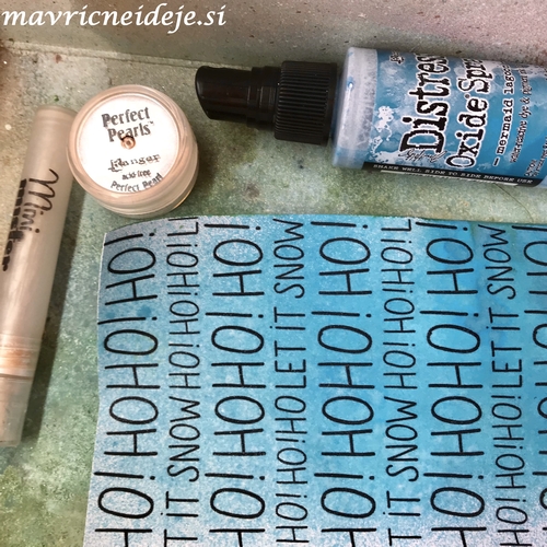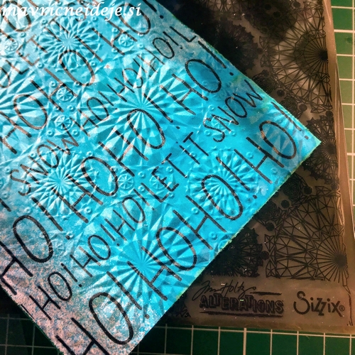Za ozadje sem bel papir obarvala z Distress Oxide spreji mermaid lagoon in iced spruce. Nato sem 3d embosirno srajčko (Sizzix 3-D Texture Fades Embossing Folder – Kaleidoscope # 663296) namazala z Black Shot Distress ink blazinico in embosirala. Za konec sem s prstom nanesla še Nuvo embellishment mousse mother pearl odtenek. drobne črke so rezalna šablona Najlepši par MINI ABECEDA