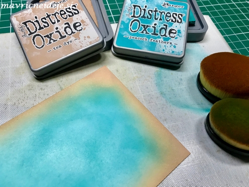 Distress Oxide peacock feathers in tea dye za osnovo, nato pa WOW embossing prah metalic silver.