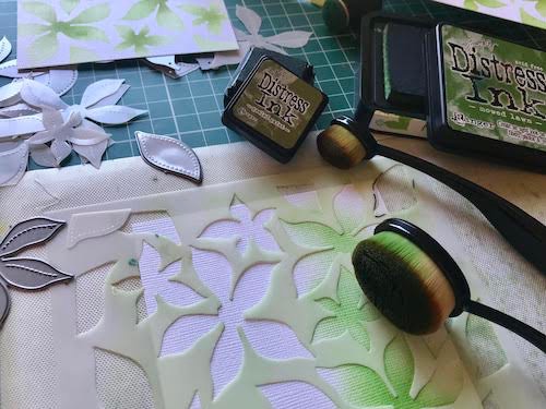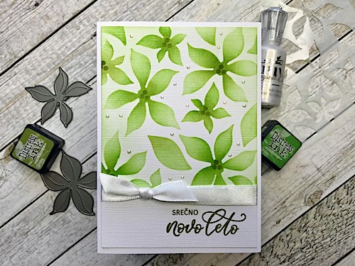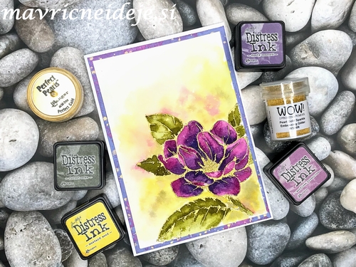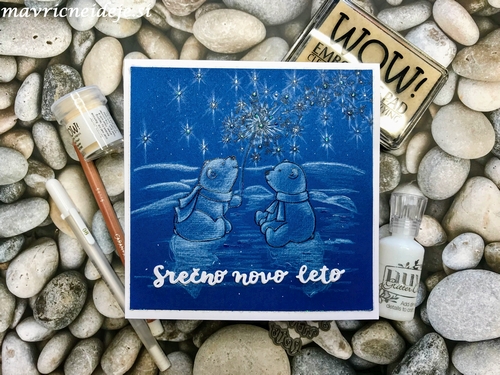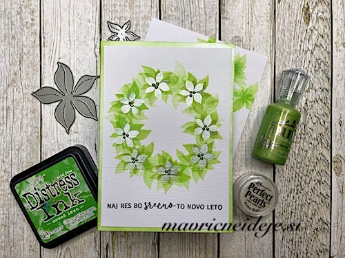Za izdelavo voščilnice sem porabila eno polo dvostranskega papirja, dodala sem napis Najlepši par, ki sem ga dvobarvno odtisnila z Distress Oxidi, bleščice so Nuvo marker s čopičem. Na jagodke sem dodala prozorne Nuvo drops.