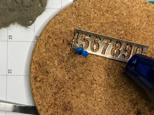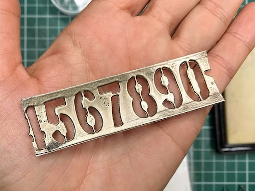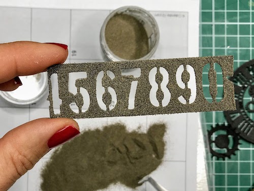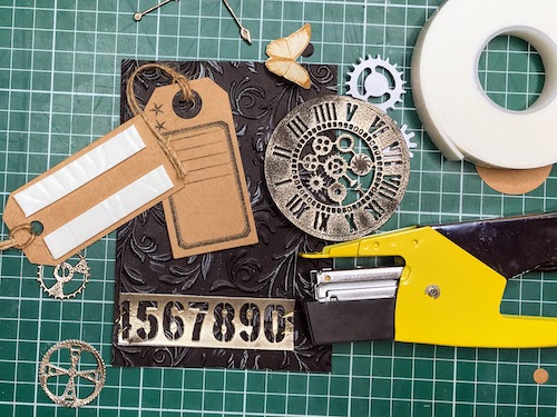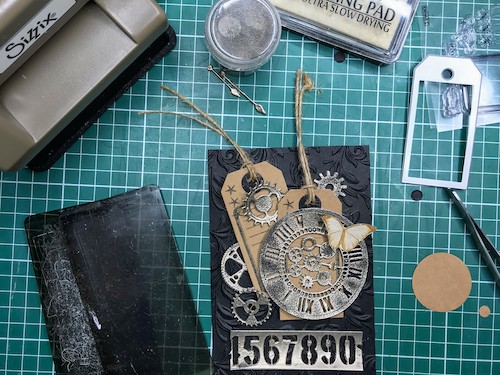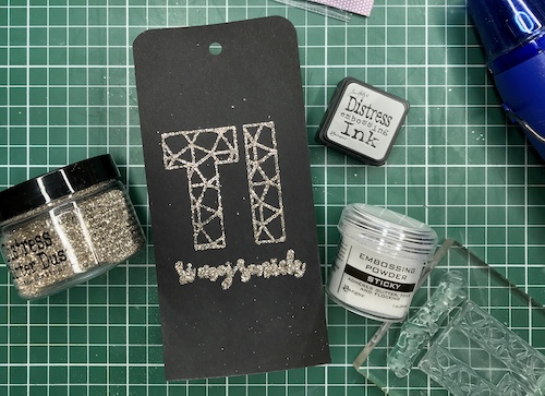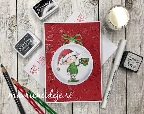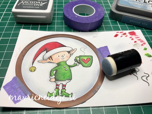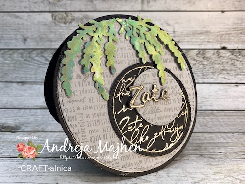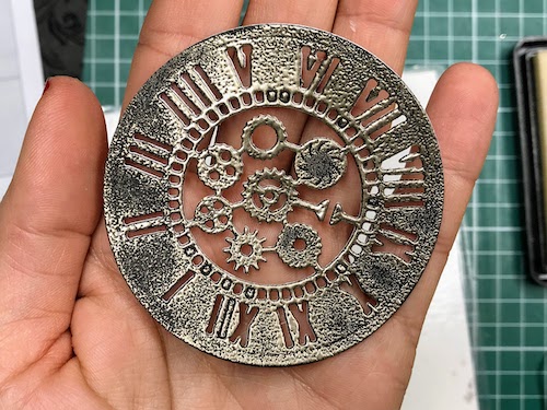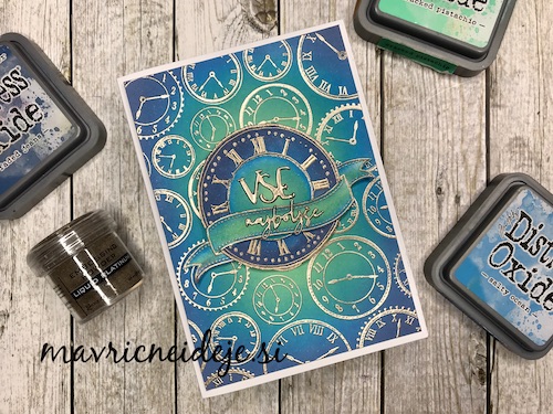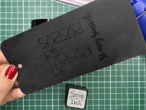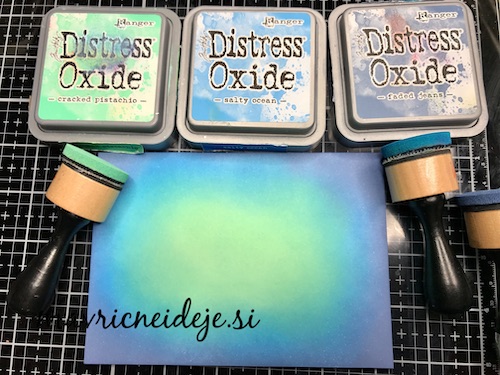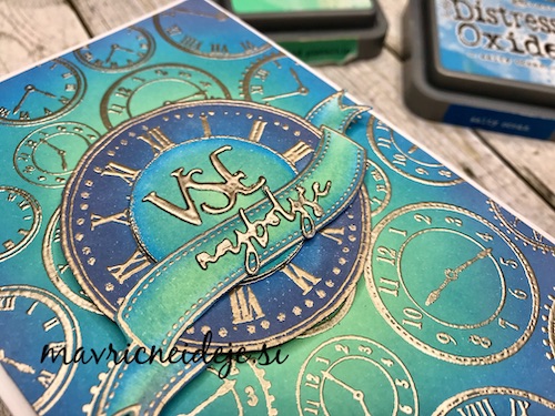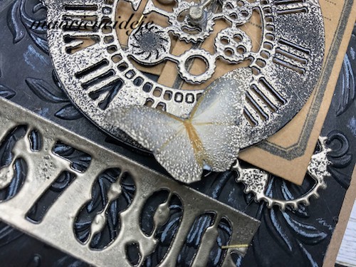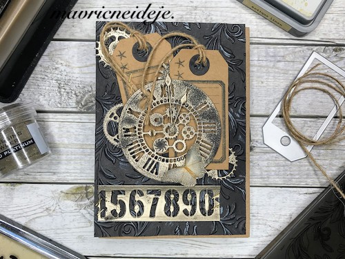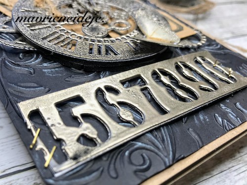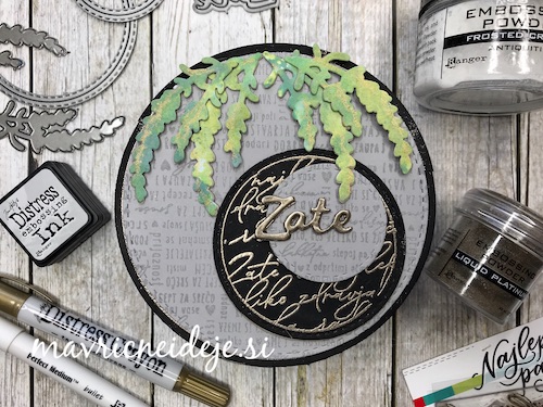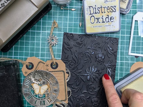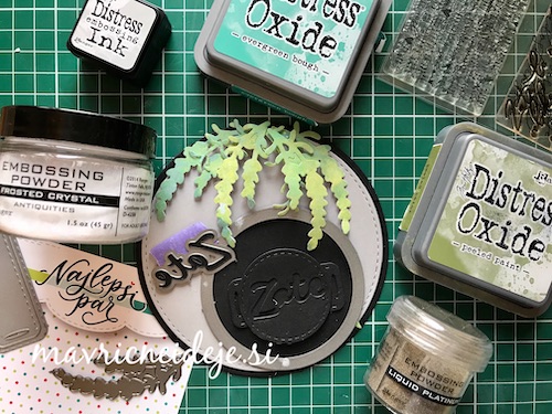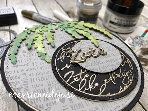 Med črnim ozadjem in ostalimi elementi mi je manjkala neka barvna povezava, zato sem na relief kar s prstom nanesla Distress Oxide antique linen. Oxidi so prekrivni in se tudi na temni podlagi lepo vidni.