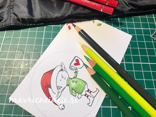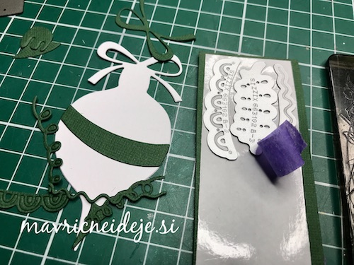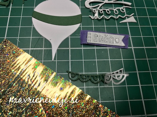 Mali sizzix strojček je vrhunski pripomoček, ki ga imam lahko ves čas na mizi. Nanj sem izrezala manjše elemente, ki se v klasični napravi skoraj izgubijo.