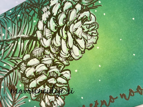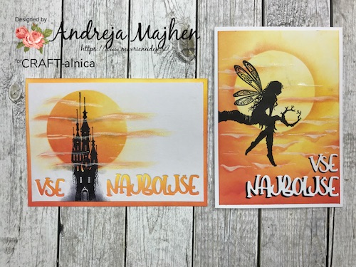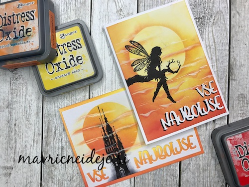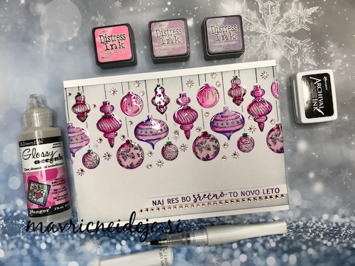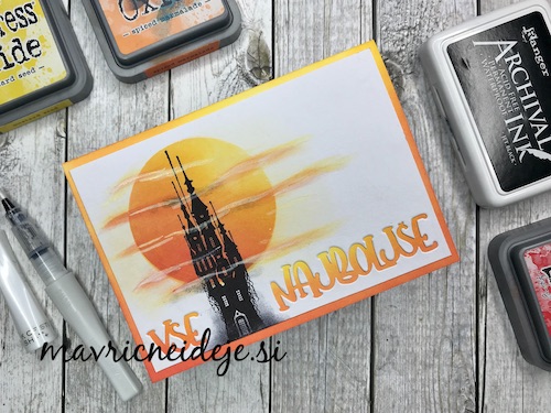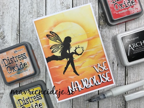 Iz ležeče postavljenega papirja sem pred barvanjem izrezala napis in ga shranila za pokončno voščilnico. Florence akvareli papir sem pobarvala z Distress Oxide mustard seed, spiced marmelade in candied apple ter z Ranger Archival Ink Jet Blach odtisnila krasne motive Lavinia Stamp.