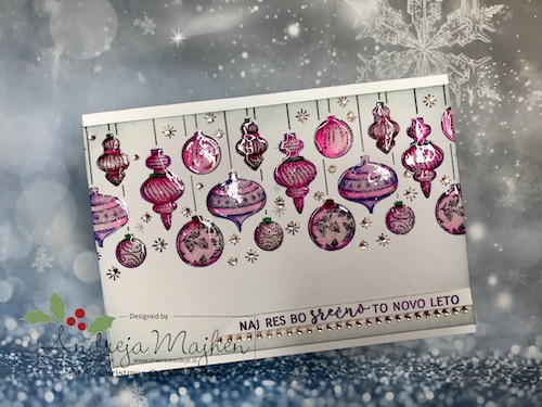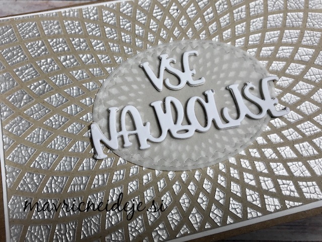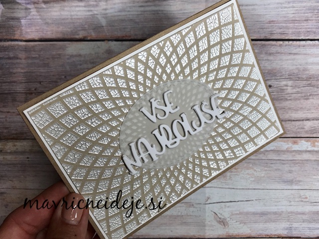 Voščilnica je malo posebna zato, ker sem osnovo previdno vstavila v rezalno šablono okrašeni pravokotniki tako, da so se na pregibu vrezali le križci. Ti so se odtisnili tudi na hrbtno stran.