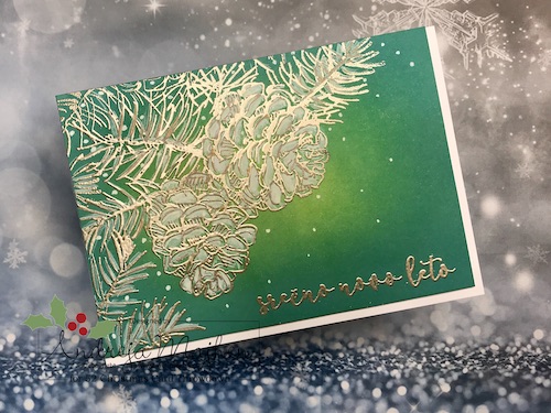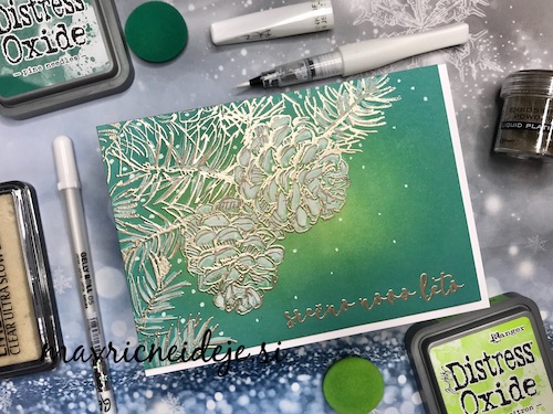 Bel papir sem pobarvala z Distress Oxide twisted citron in pine needles. Nato sem motiv odtisnila z WOW1 embosing blazinico in potresla z Ranger Liquid Platinum embosing prahom in utrdila v grelno napravo.