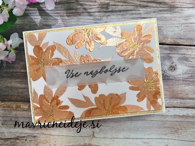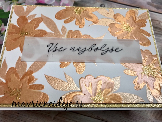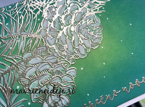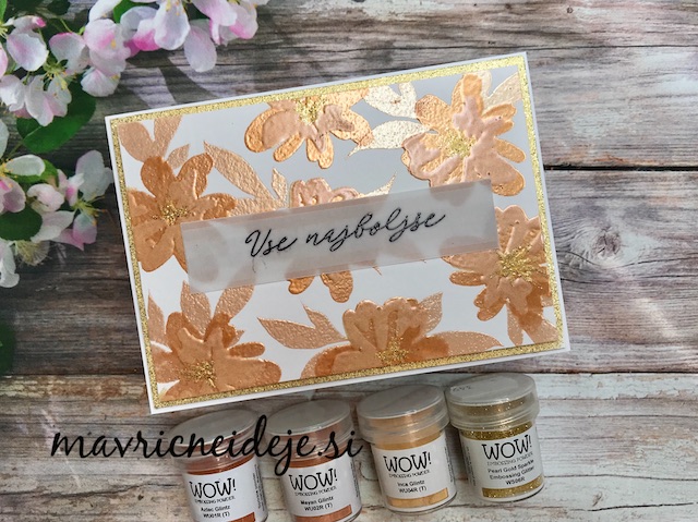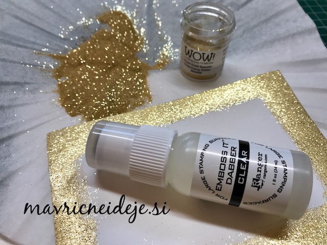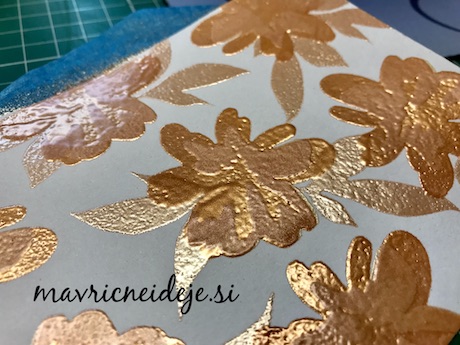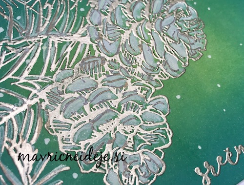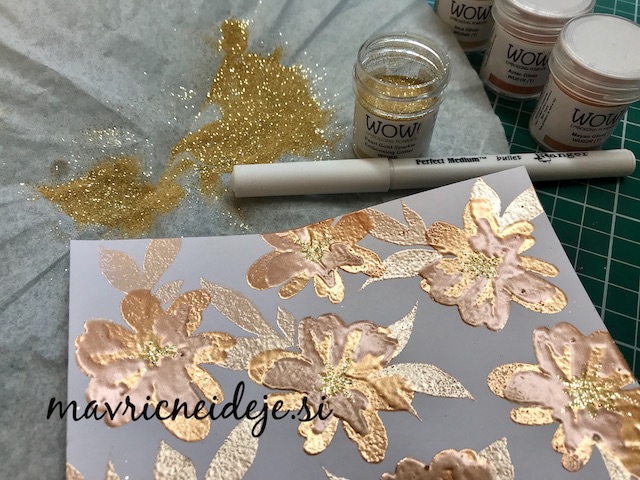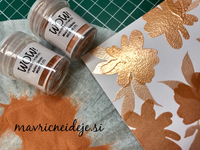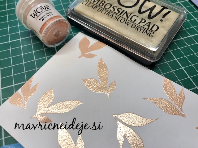Že pri izdelavi šablone sem imela v mislih uporabo z embosing prahci in danes sem se zadeve res lotila. Najprej sem embosing blazinico s tapkanjem nanesla preko stencil šablone listkov in embosirala wow prahec inca glintz.