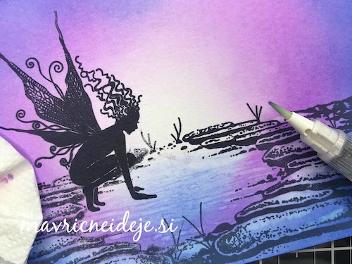 Nadaljevala sem z vodnim čopičem, s katerim sem barvo odvzemala.