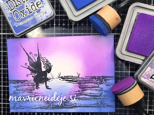Na Flrence akvarelni papir sem z Archival ink jet blach blazinico odtisnila krasne motive Lavinia Stamp in nadaljevala z Distress Oxide blueprint sketch in vilted violet.