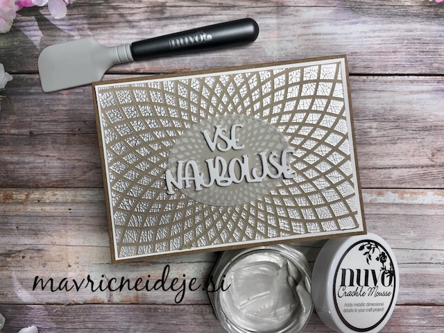 Danes sem prvič uporabila Nuvo Craclke mousse teksturno pasto, ki pri sušenju razpoka. Izbrala sem odtenek Russian White, ki ima čudovit pearl sijaj in jo z lopatico nanesla preko stencil šablone.