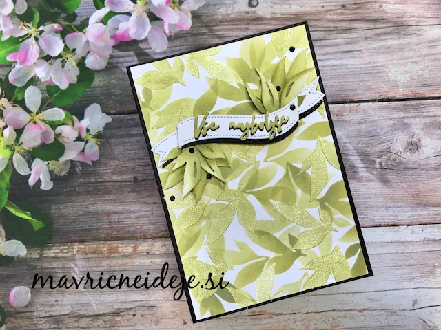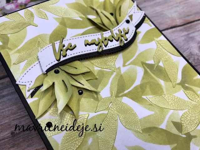 Stencil šablona zelenje, ki sem jo izdelala po navodilih Tine- Najlepši Par je idealna za izdelavo ozadja. Pri postavitvi pa sem tokrat sledila izzivu Ko me inspirira in dodatke postavila v zgornjo tretino voščilnice.
