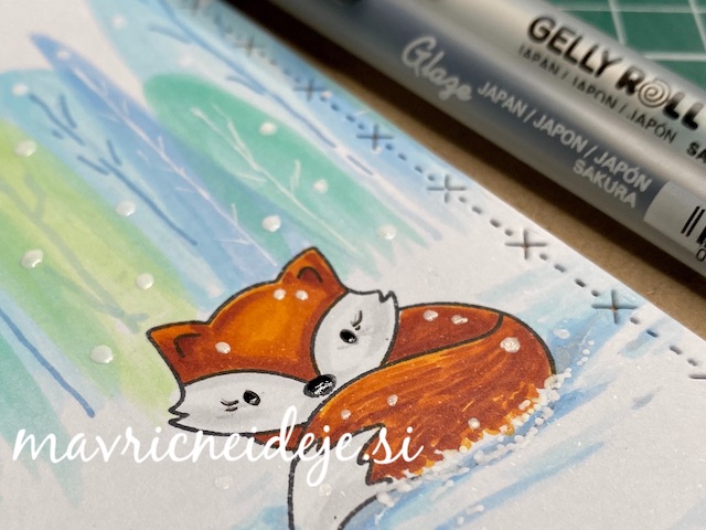 Medveda sem pobarvala s Copic markerji in mu preko THS woodgrain šablone izdelala drsalno površino, najprej z Distress Oxide crackle pistachio, nato pa še NUVO crackle mousse – russian white.