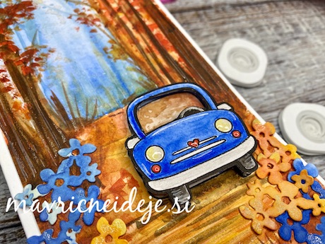 A akvarelni tehniki sem narisala ozadje in nato na voblerček namestila izrezan avtomobilček – Najlepši Par. Cvetlice so iz seta rezalnih šablon Najlepši par skodelica. Vse skupaj sem pobleščala z Wink of Stella markerjem.