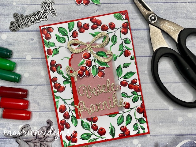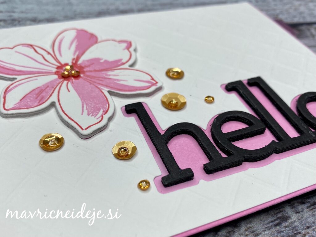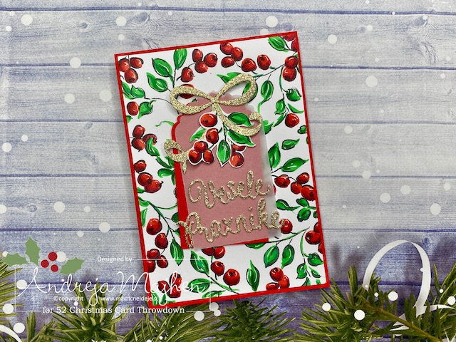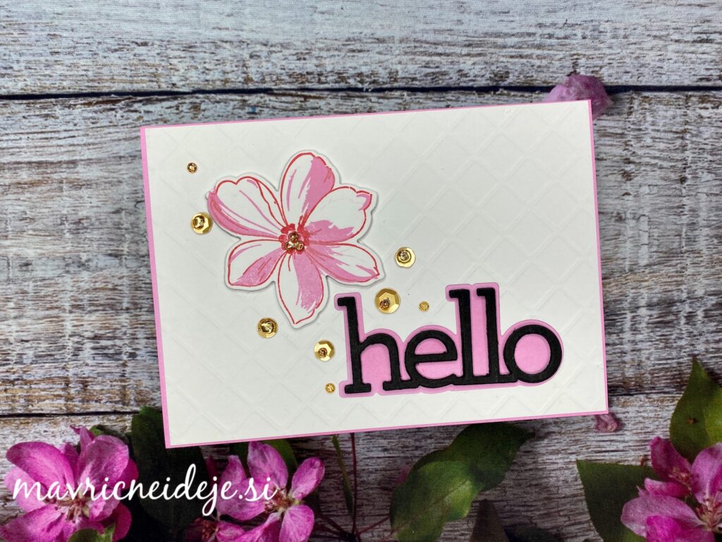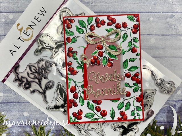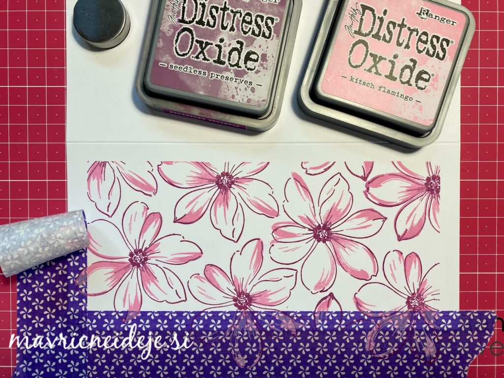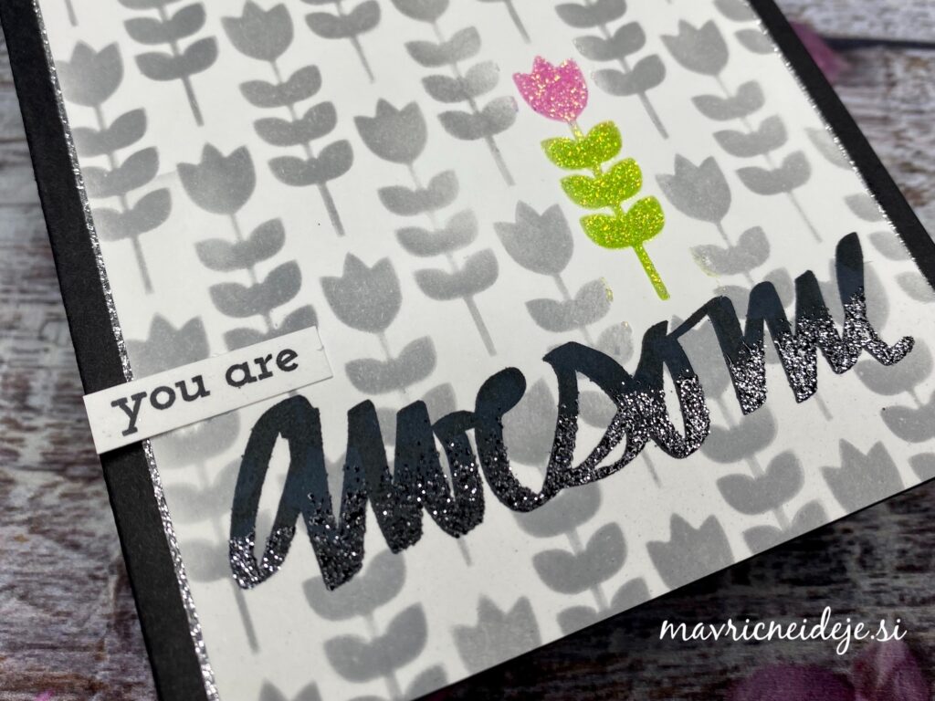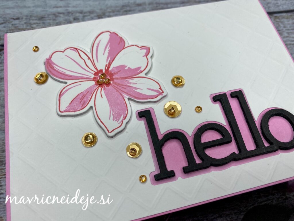 V poglavju AECP Easy Die Cutting Techniques je predstavljenih kar nekaj tehnik z rezalnimi šablonami, ki izrežejo celo ozadje, teh pa žal nimam, zato sem morala za to domačo nalogo kar malce potriditi. Yana Smakula je na srečo pokazala še veliko drugih tehnike in tako je nastala skoraj CAS voščilnica v aktualni kitsch flamingo barvi. Uporabila sem Altenew trellis stencil; Altenew fabulous florets štampiljke, Distress oxide kitsch flamingo, festive berries; Altenew satin gold sequins; Ranger glossy accent, belo osnovo za voščilnico, bel papir; penasto – kapa plščo, belo in črno.