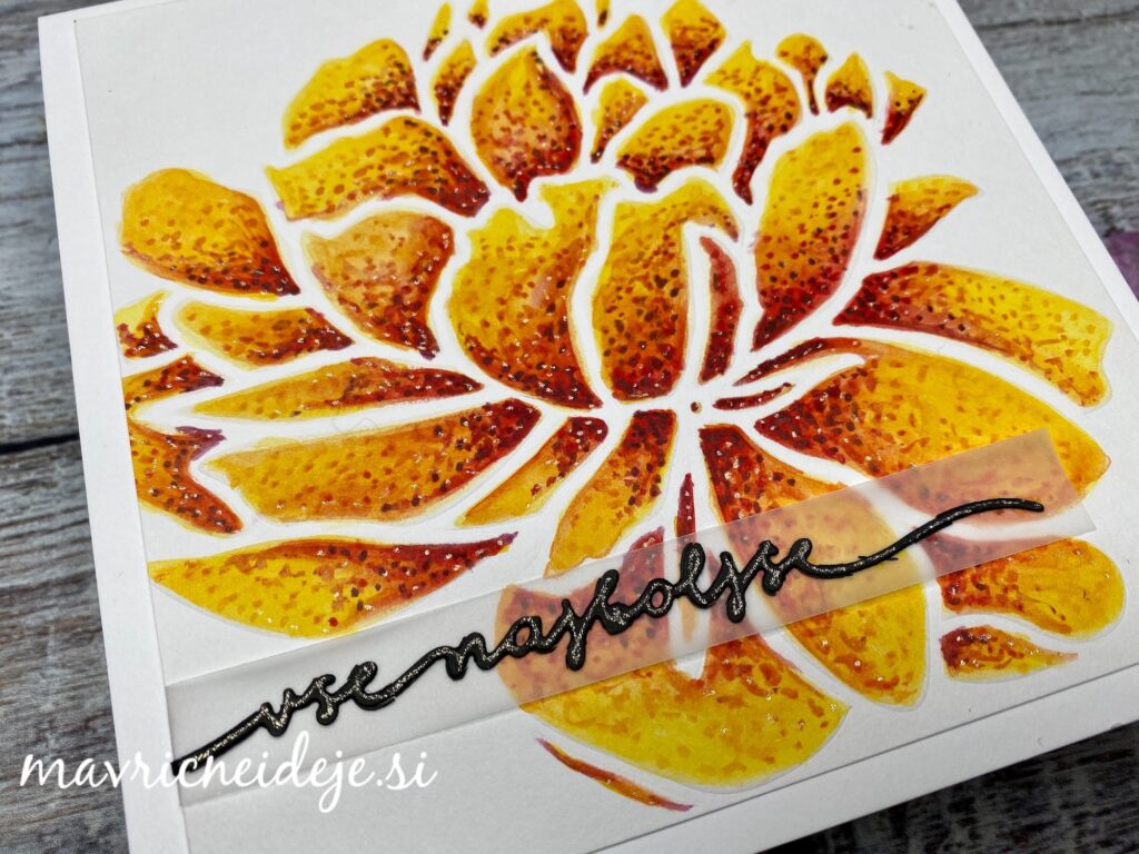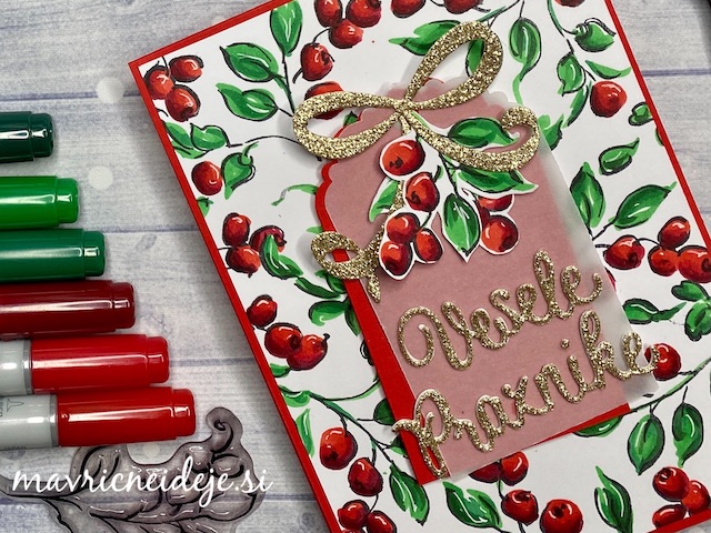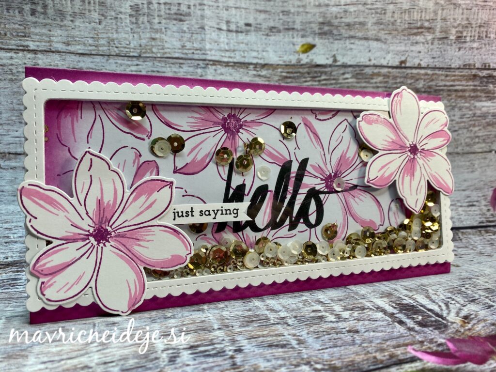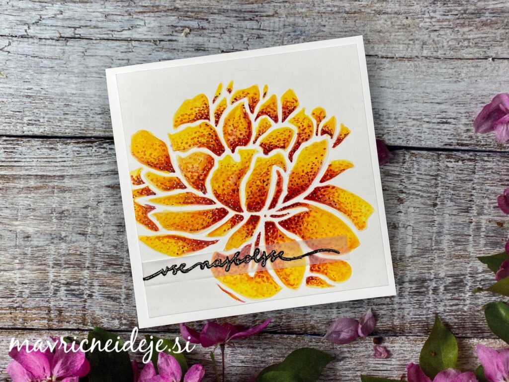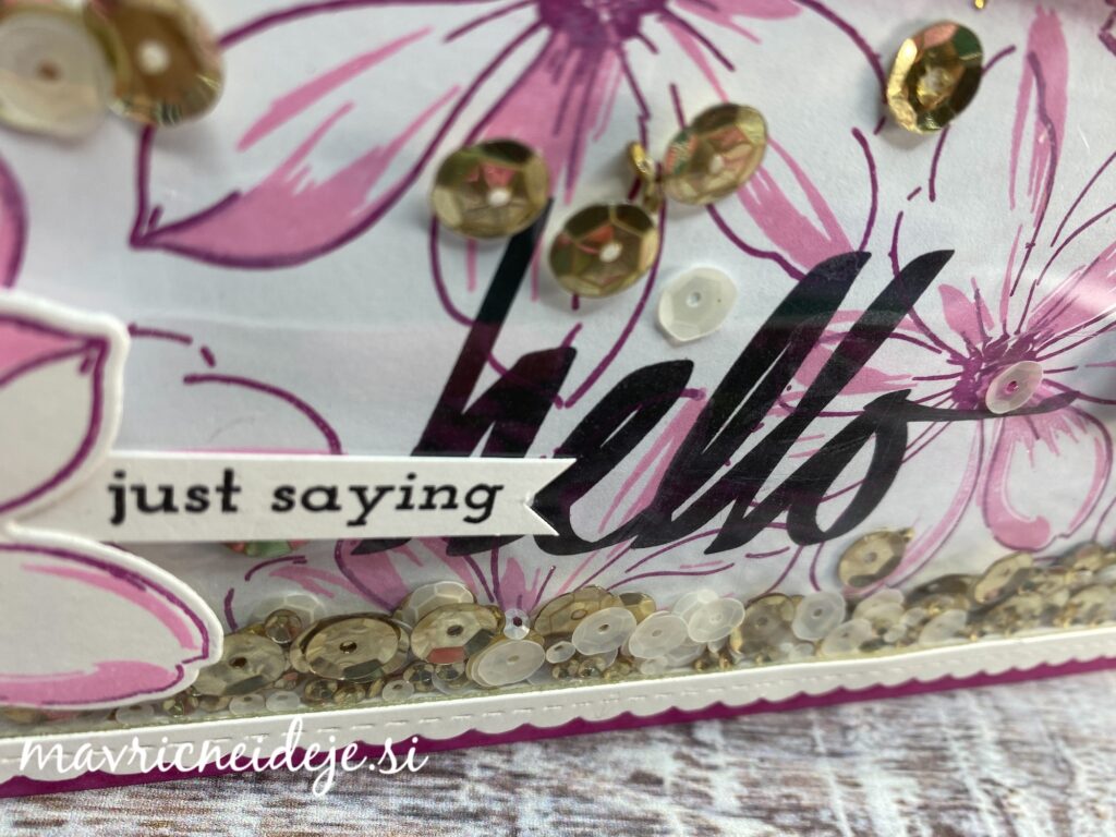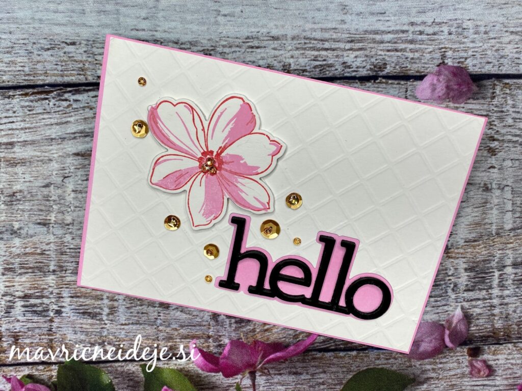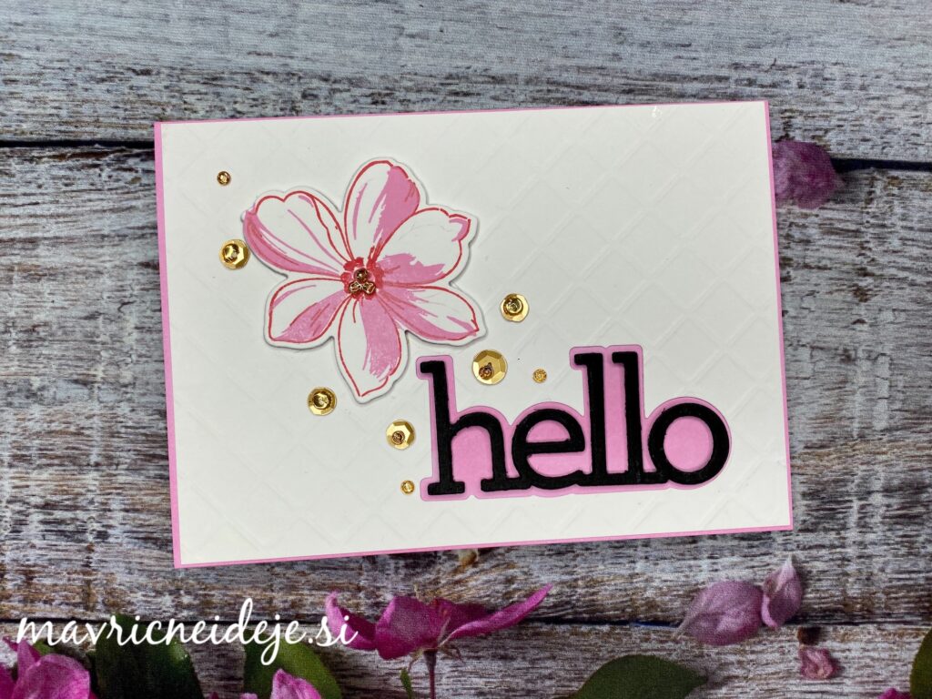 V poglavju AECP Easy Die Cutting Techniques je predstavljenih kar nekaj tehnik z rezalnimi šablonami, ki izrežejo celo ozadje, teh pa žal nimam, zato sem morala za to domačo nalogo kar malce potriditi. Yana Smakula je na srečo pokazala še veliko drugih tehnike in tako je nastala skoraj CAS voščilnica v aktualni kitsch flamingo barvi. Uporabila sem Altenew trellis stencil; Altenew fabulous florets štampiljke, Distress oxide kitsch flamingo, festive berries; Altenew satin gold sequins; Ranger glossy accent, belo osnovo za voščilnico, bel papir; penasto – kapa plščo, belo in črno.