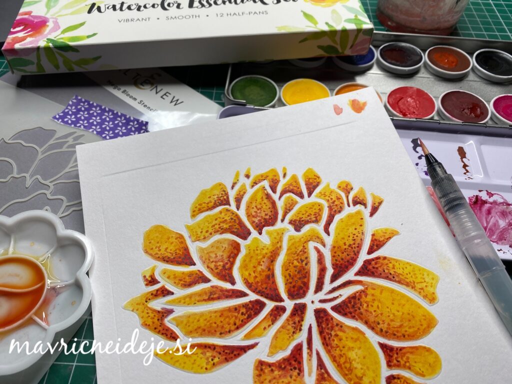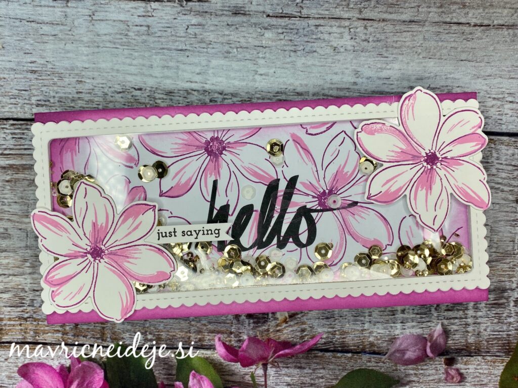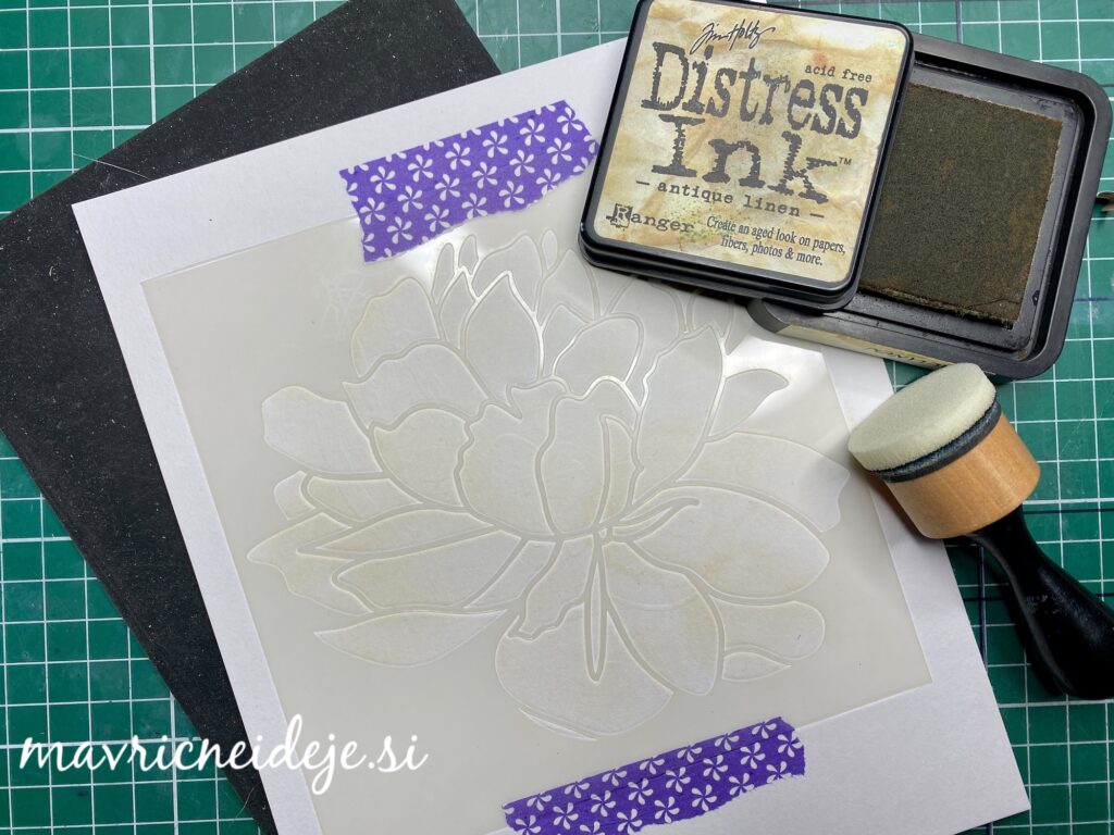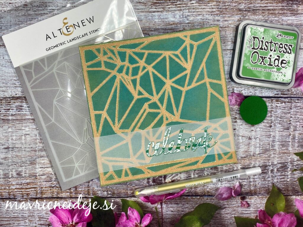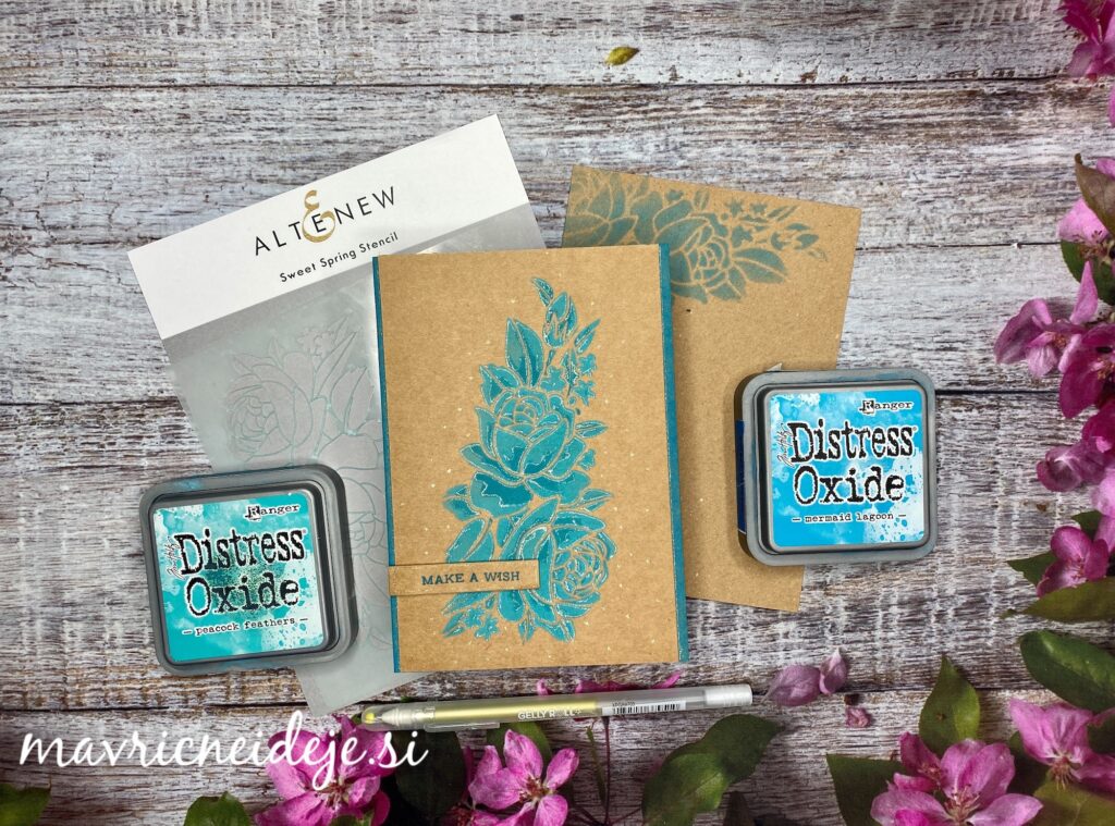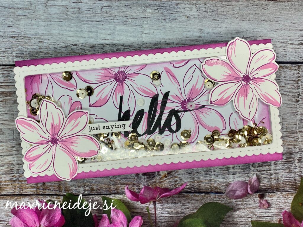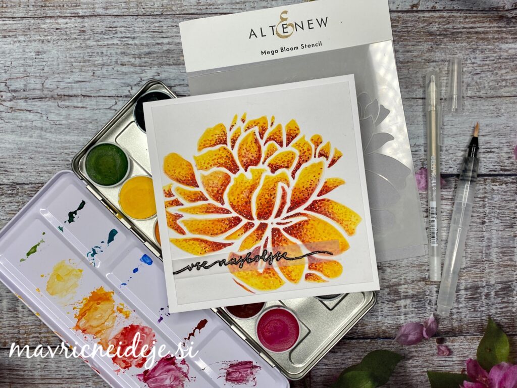 V poglavju AECP Easy Die Cutting Techniques je predstavljenih kar nekaj tehnik z rezalnimi šablonami, ki izrežejo celo ozadje, teh pa žal nimam, zato sem morala za to domačo nalogo kar malce potriditi. Yana Smakula je na srečo pokazala še veliko drugih tehnike in tako je nastala skoraj CAS voščilnica v aktualni kitsch flamingo barvi. Uporabila sem Altenew trellis stencil; Altenew fabulous florets štampiljke, Distress oxide kitsch flamingo, festive berries; Altenew satin gold sequins; Ranger glossy accent, belo osnovo za voščilnico, bel papir; penasto – kapa plščo, belo in črno.
