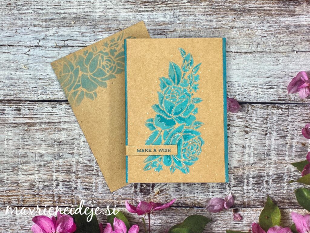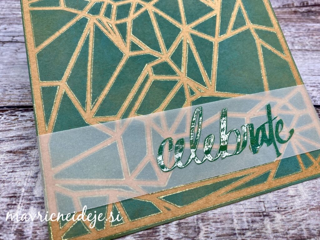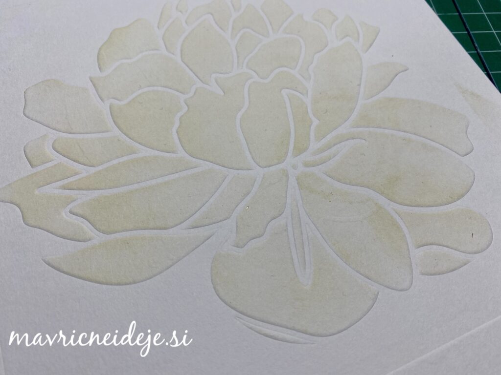 Na bel papir sem odtisnila cvet in ga izrezala s pripadajočo šablono, prav tako sem izrezala besedo. nato sem ta papir embosirala s pomočjo stencil šablone, izreze pa sem pred sestavljanjem voščilnice podložila s penasto – kapa ploščo.