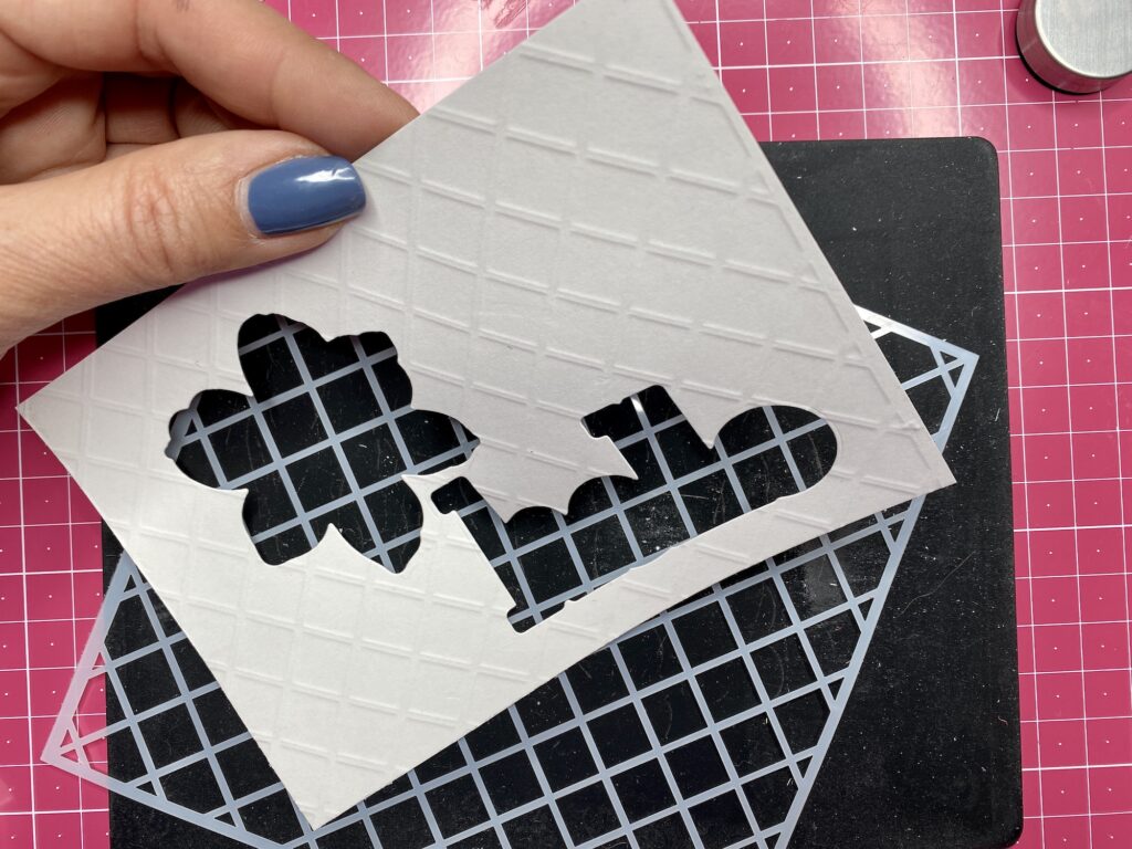 The AECP Easy Die Cutting Techniques chapter presents quite a few techniques with cutting dies that cut out the entire background, but unfortunately I don’t have these, so I had to work a little harder for this homework. Fortunately, Yana Smakula showed many other techniques and so an almost CAS card in the modern kitsch flamingo color was created. I used Altenew trellis stencil; Altenew fabulous florets stamps, Distress oxide kitsch flamingo, festive berries; Altenew satin gold sequins; Ranger glossy accent, white card base, white paper; foamy – kapa flat white and black.
