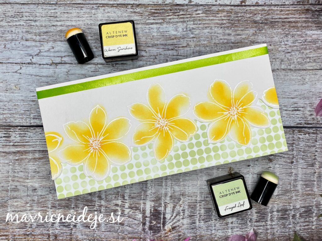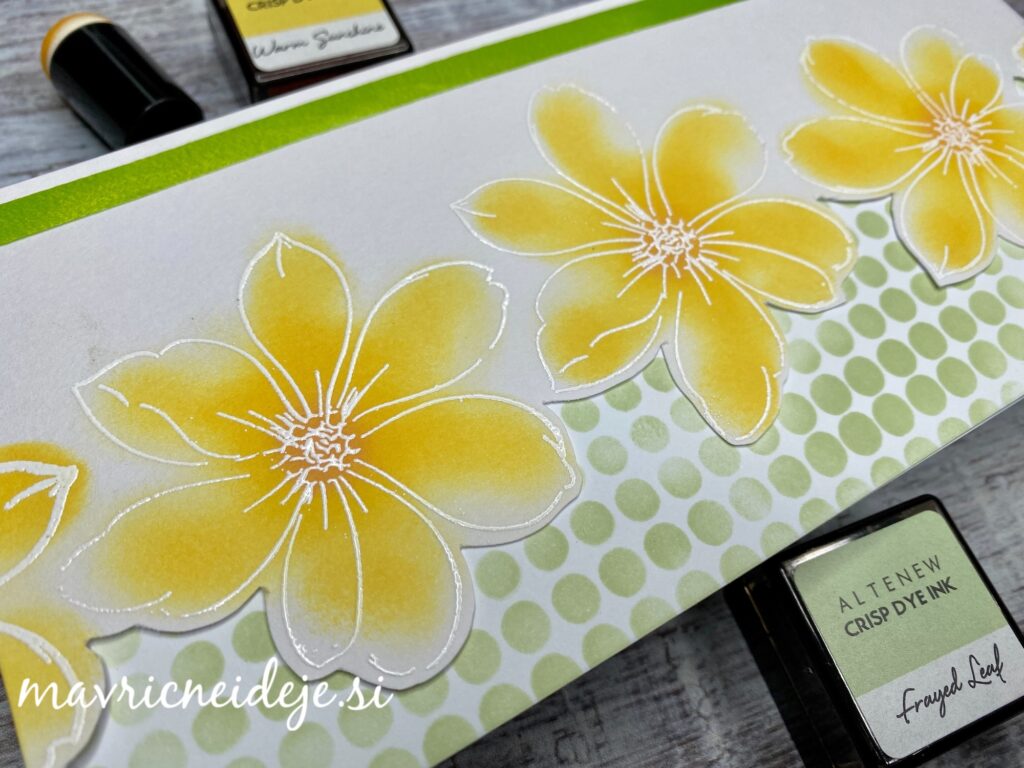 Na Florence akvarelni papir sem z belim prahom embosirala odtise (Altenew Fabulous Florets Stamp Set), ki sem jih uredila v naključen vzorec. Nato sem z naprstnim aplikatorjem nanesla Altenew inke in vse skupaj izdatno pošpricala z vodo.