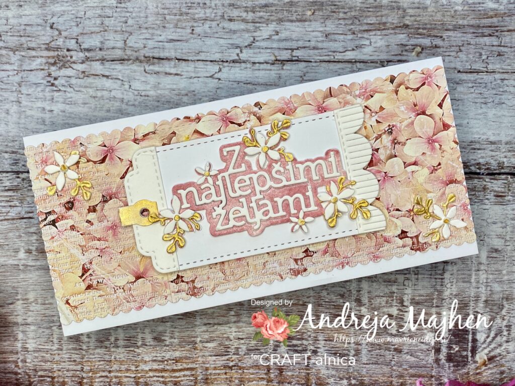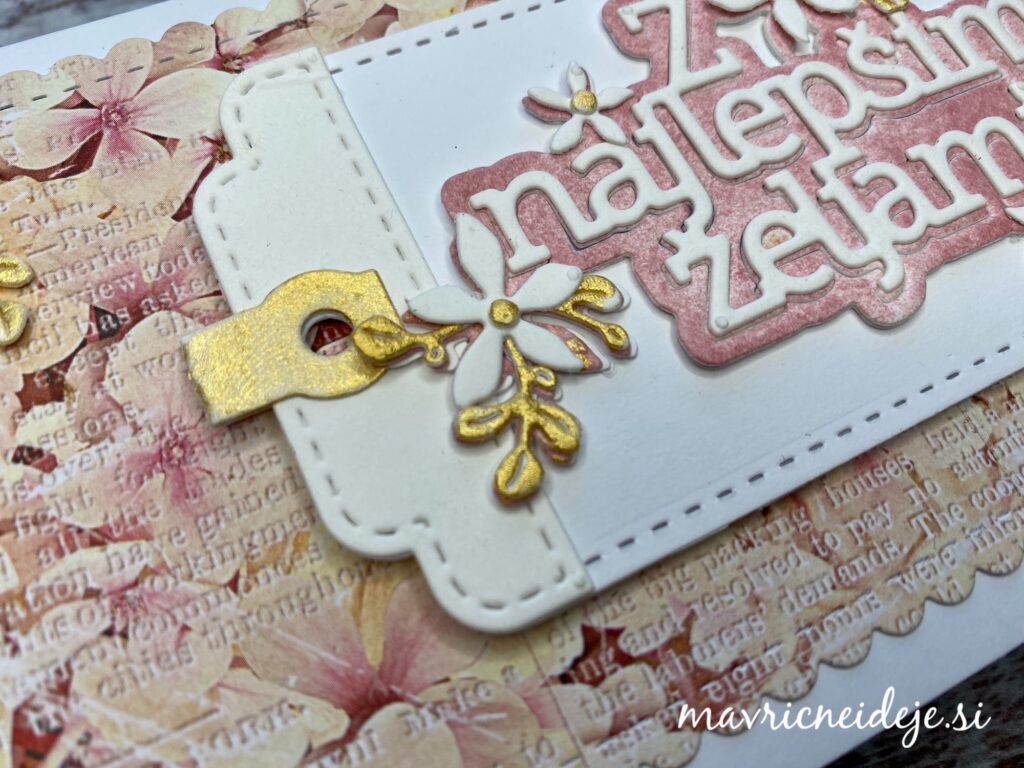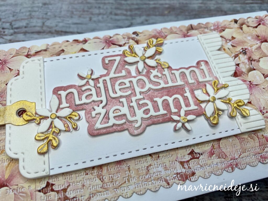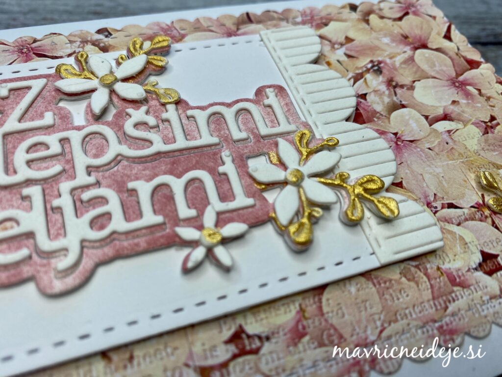 Na prvi voščilnici so izrezi črk in rožic iz WC papirja, barvala sem z Distress ink blazinico in zlato akvarelno barvo.