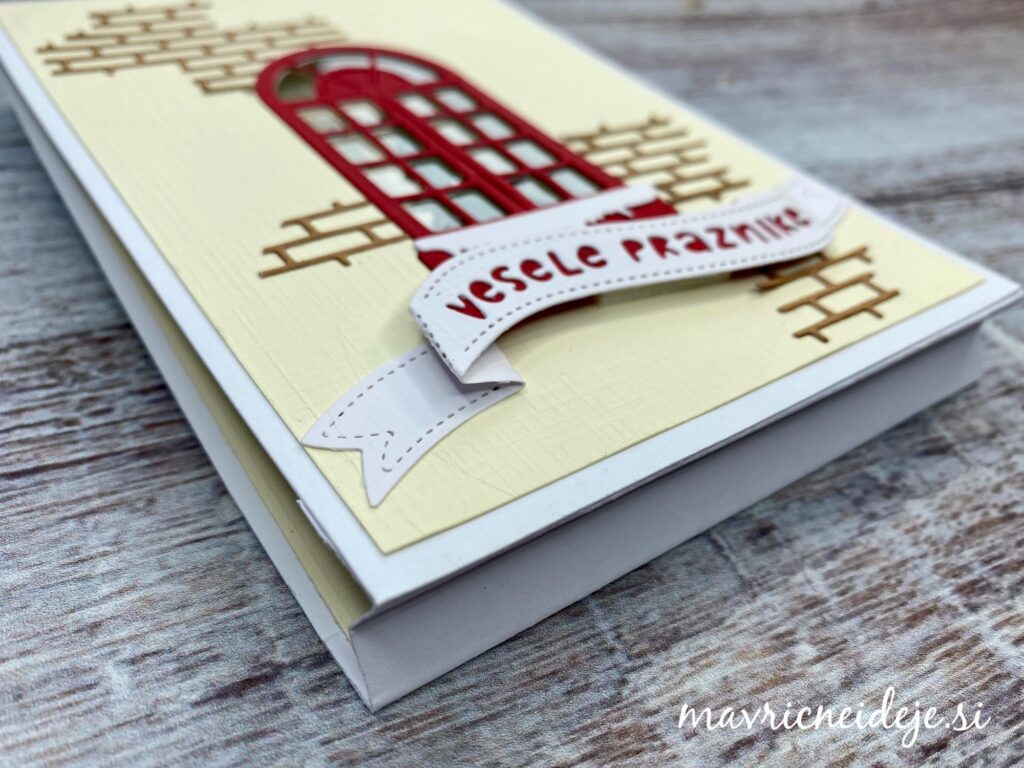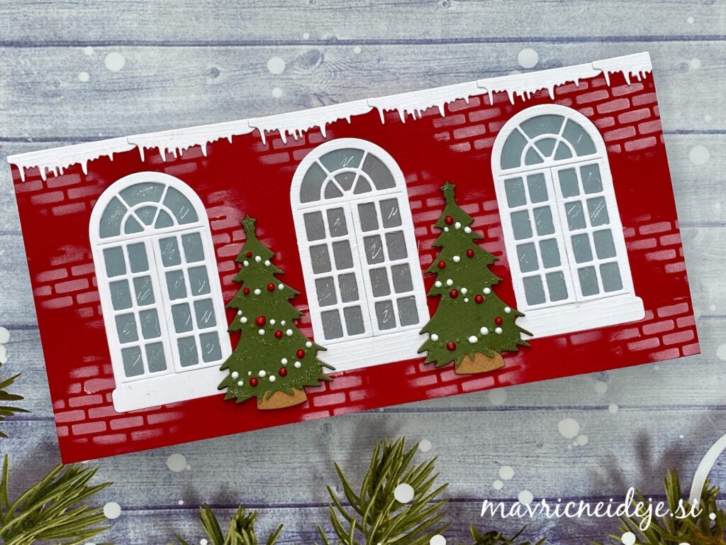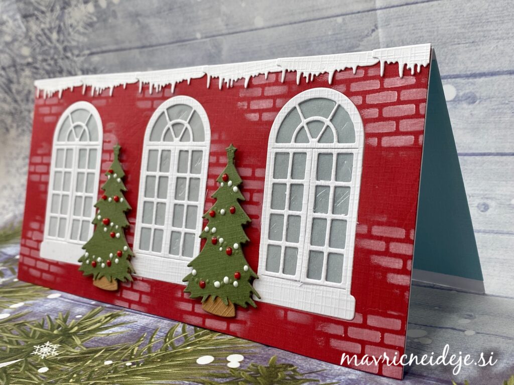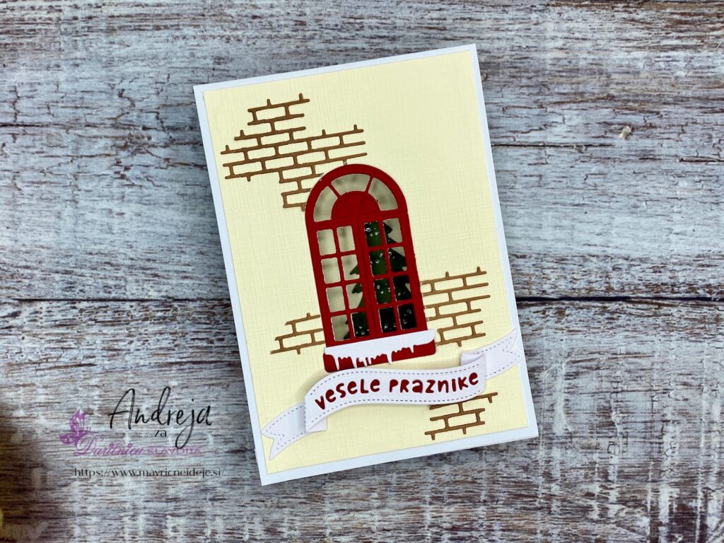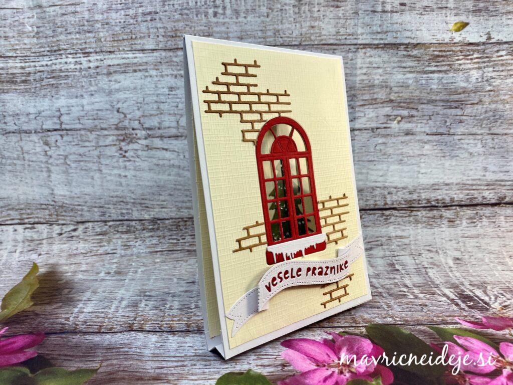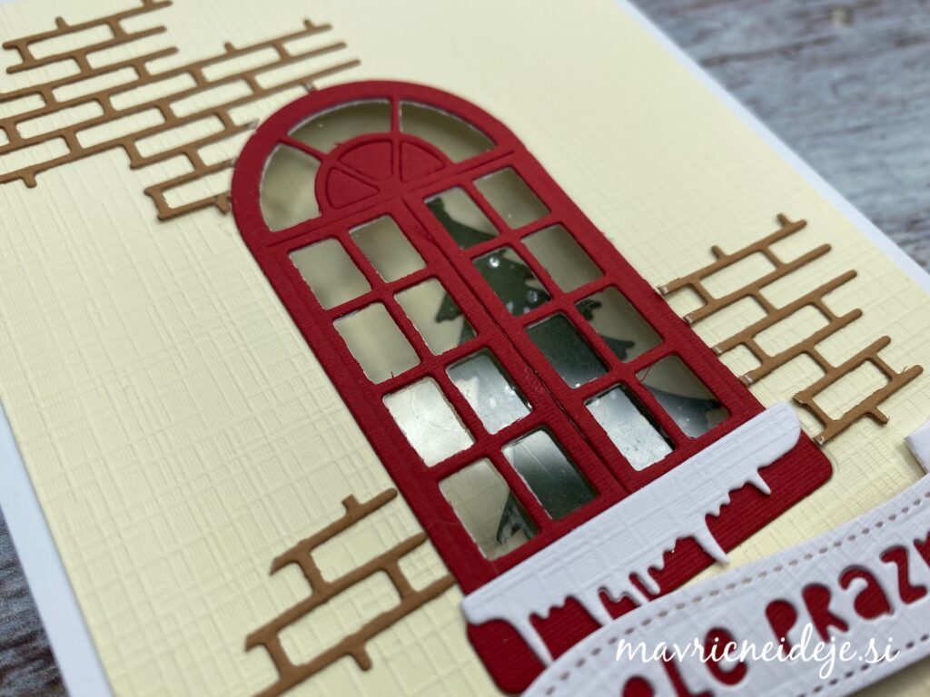 Uporabila sem rezalno šablono Yvonne Creations Christmas Window Die ~ Family Christmas, ki vsebuje okno, smrečico, lanterno, opeke in sneg in izdelala samostoječo voščilnico z oknom.
