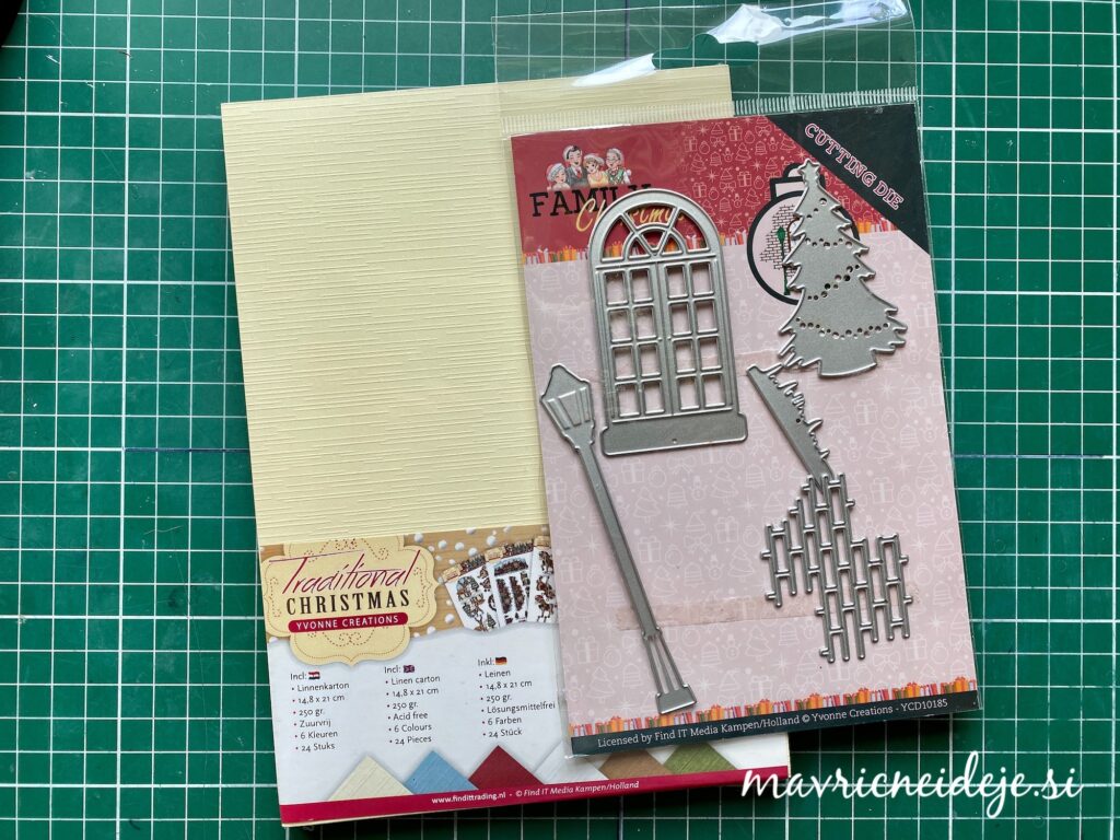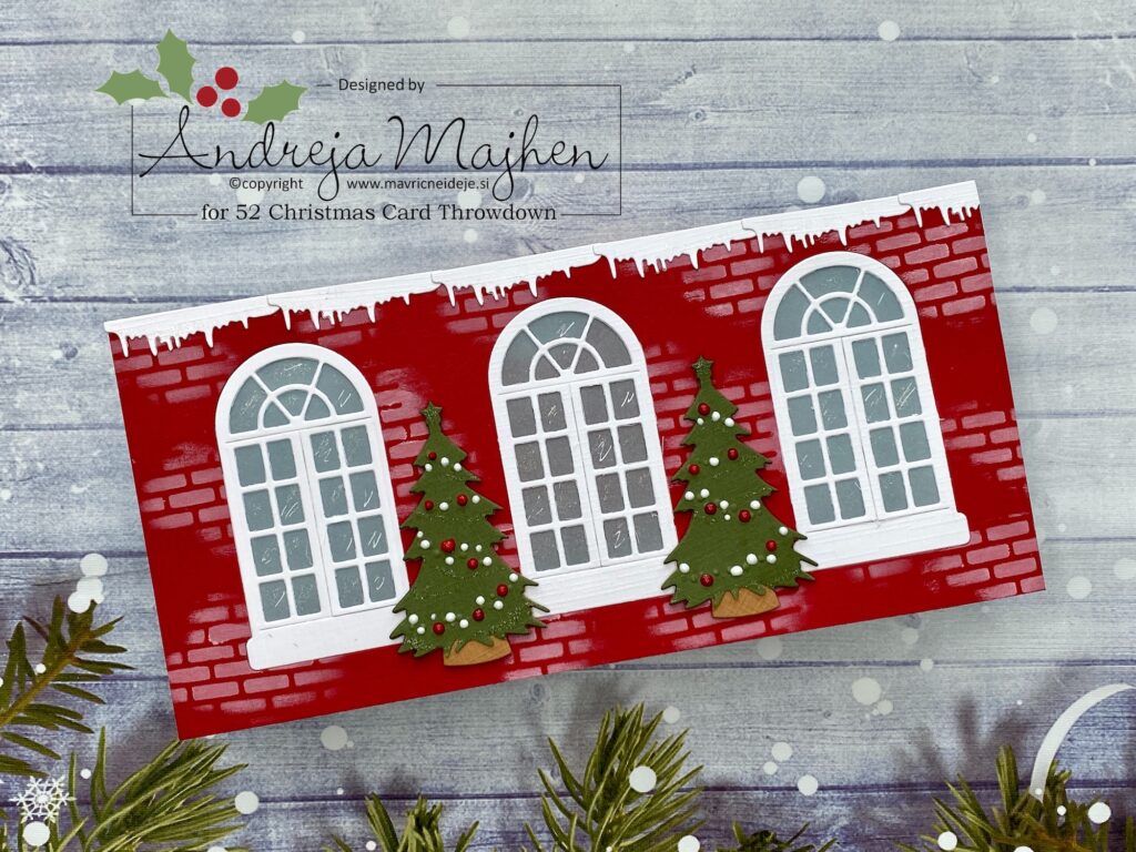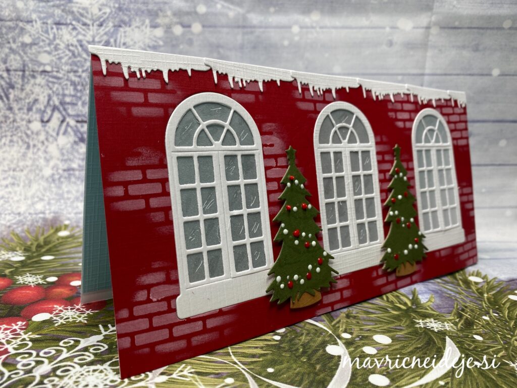 Uporabila sem papir Yvonne Creations Traditional Christmas, ki ima nežno teksturo, rezalne šablone Najlepši Par za voščilo in rezalno šablono Yvonne Creations Christmas Window Die ~ Family Christmas, ki vsebuje okno, smrečico, lanterno, opeke in sneg ter izdelala slimline samostoječo voščilnico s tremi okni.