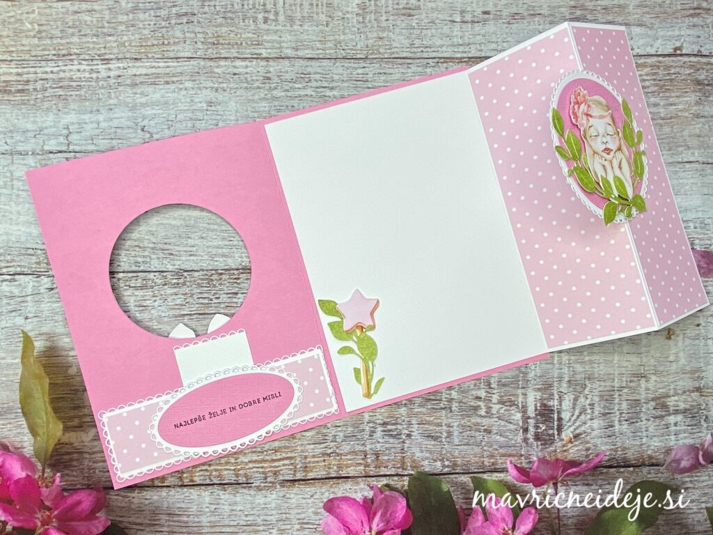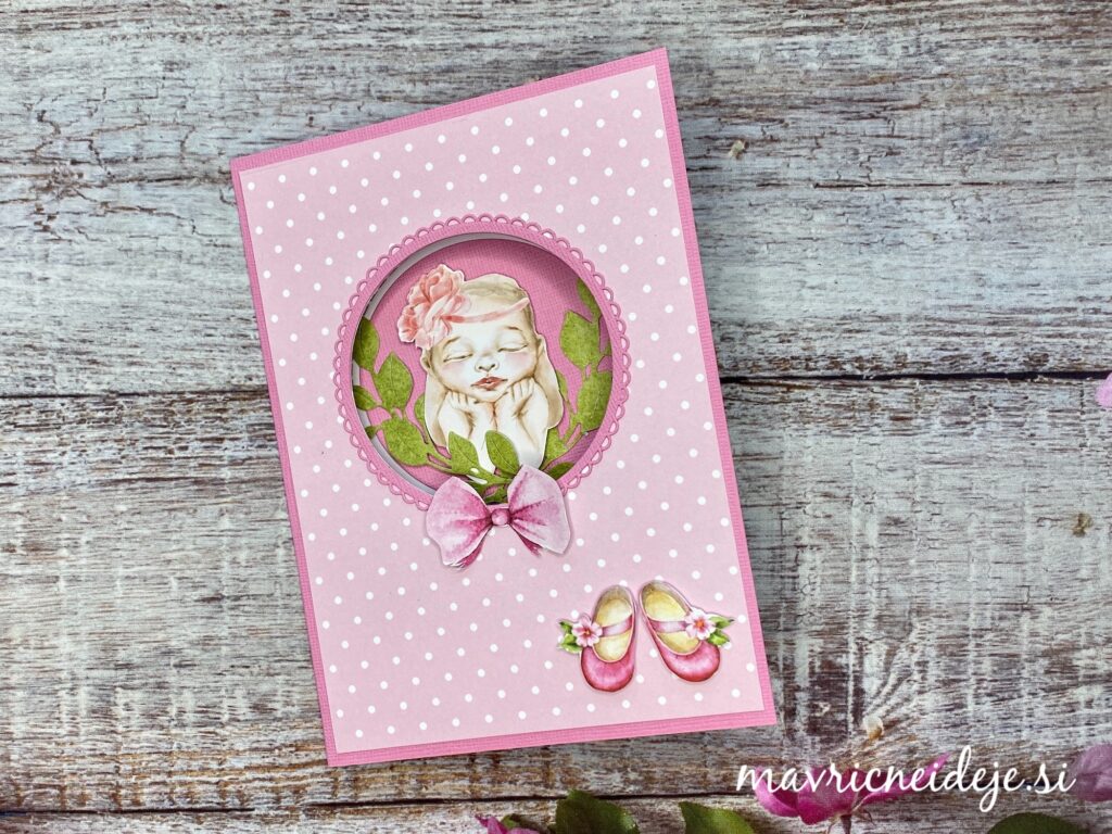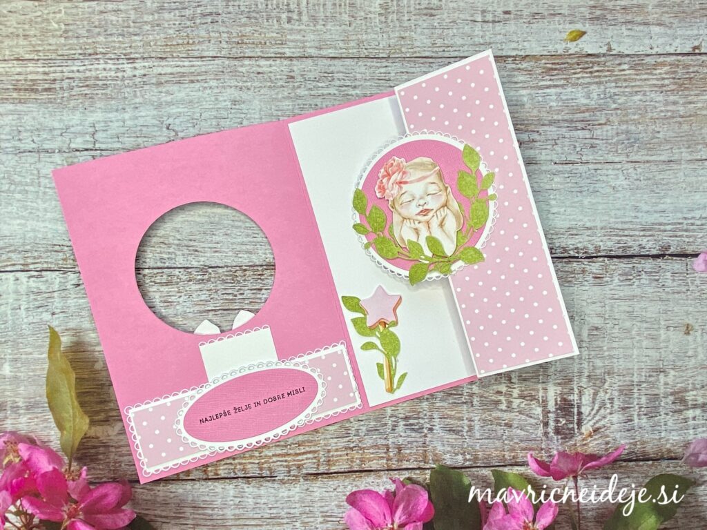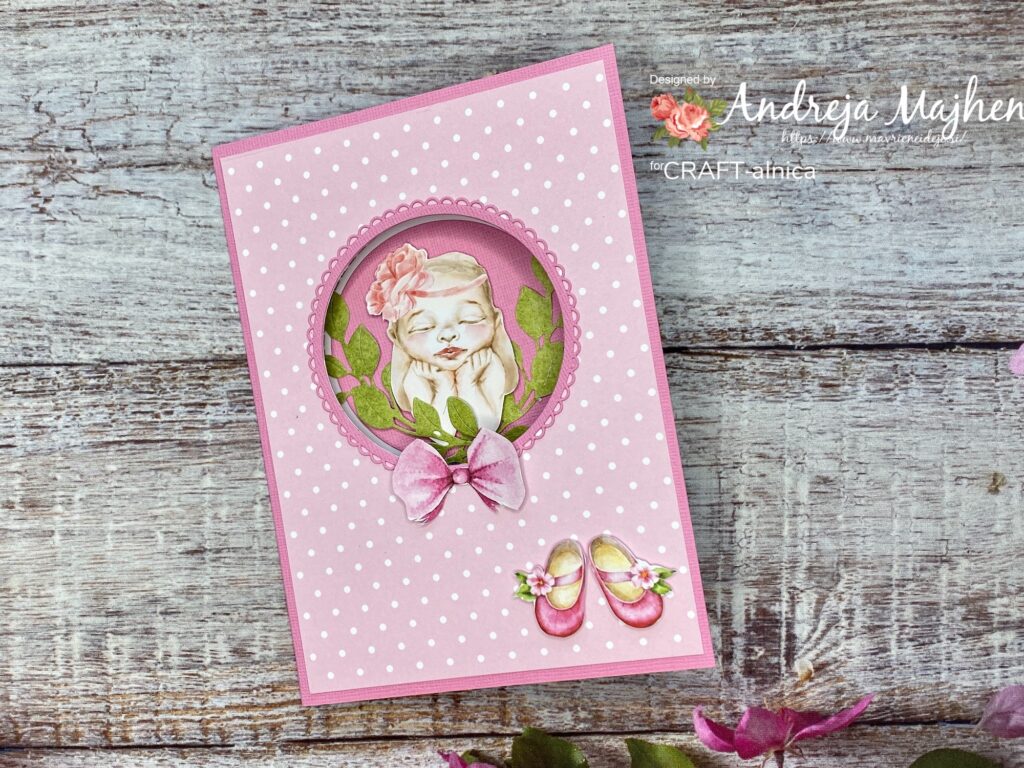 Uporabila sem: papir s teksturo; Zulana Creations Cute Baby Girl papir s pikami, LemonCraft papir Baby Boom in Leaves 05; belo osnovo 5×7 inch, rezalne šablone krogi Crea-Nest-lies, Najlepši par vejica in štampiljka, lepilo ter škarje.