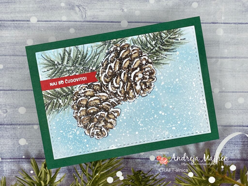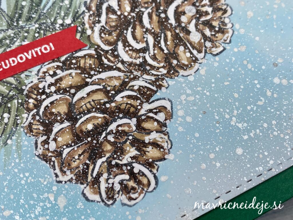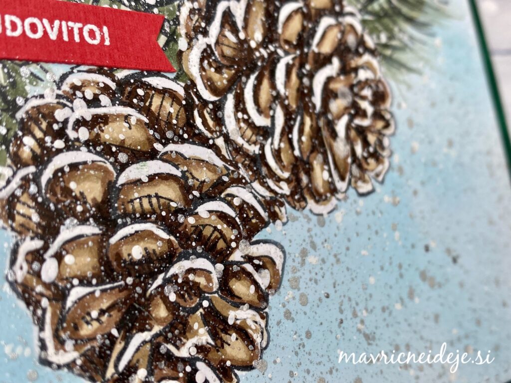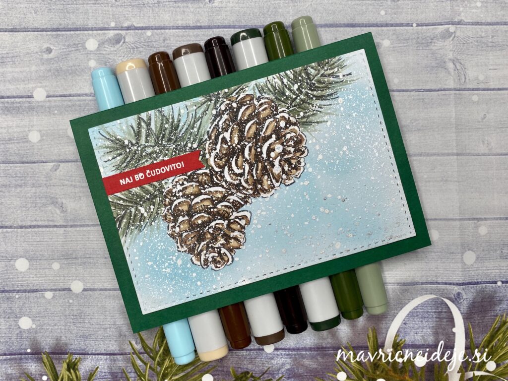 Na Color Copy 300g papir sem s črno memento blazinico odtisnila motiv storžev in jih pobarvala s Copic markerji.