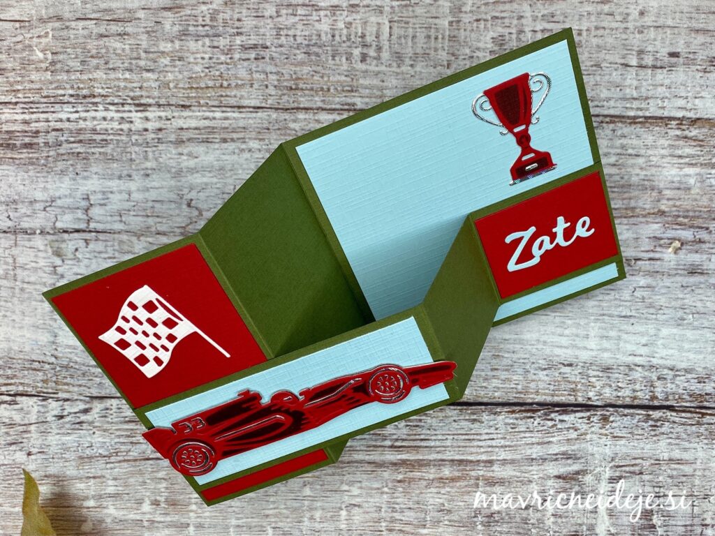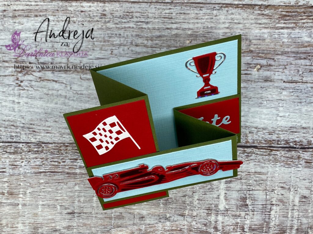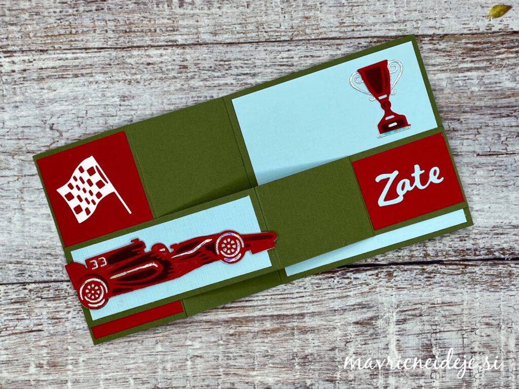 Dirkalnik sem namestila na sprednjo stran voščilnice. Na enak način, kot dirkalnik sem izdelala še pokal.