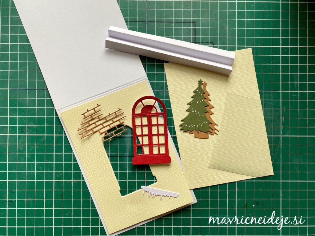 Drugi kos krem papirja sem namestila v notranjost voščilnice in dodala smrečico tako, de se jo vidi skozi okno. Iz belega papirja sem izdelala harmoniko, ki sem jo nalepila na spodnji rob osnove. Predlagam, da je pregib harmonike visok vsaj 2cm, saj bo tako voščilnica lepo stabilna. Če pa izdelate še višjo, bo v voščilnici prostor za čajno lučko.
