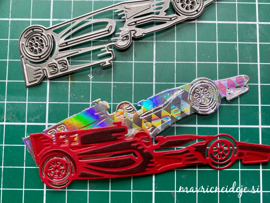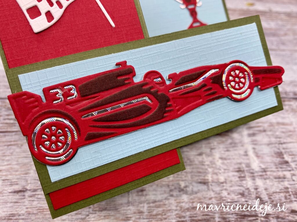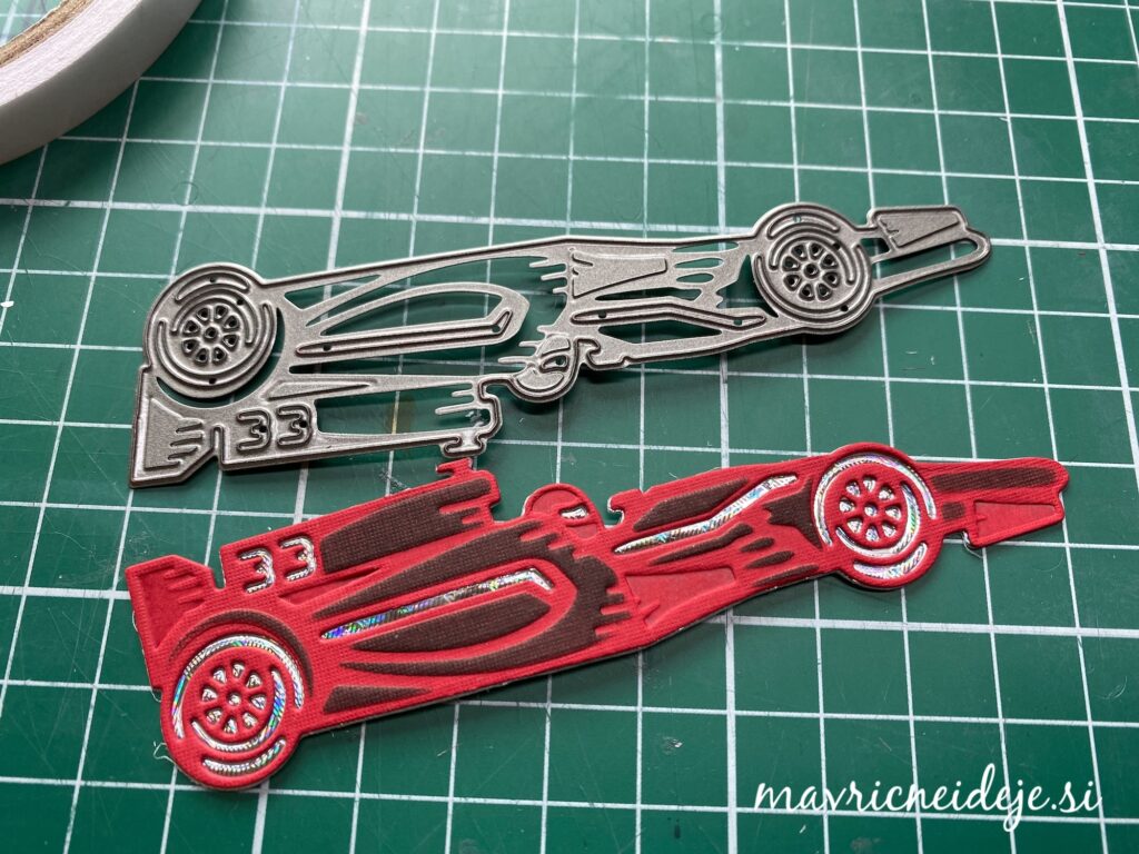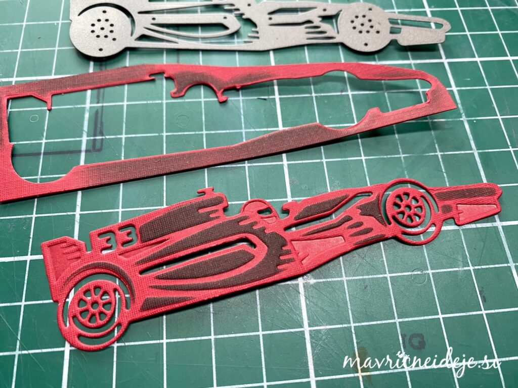 Iz rdečega papirja s teksturo sem z rezalno šablono izrezala motiv dirkalnika, nato vse še embosira na gumijasti podlagi. S črno blazinico sem kar preko rezalne šablone osenčila izrez.