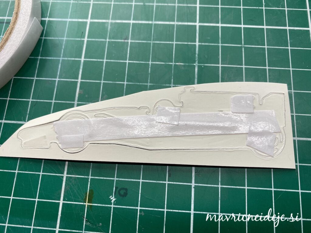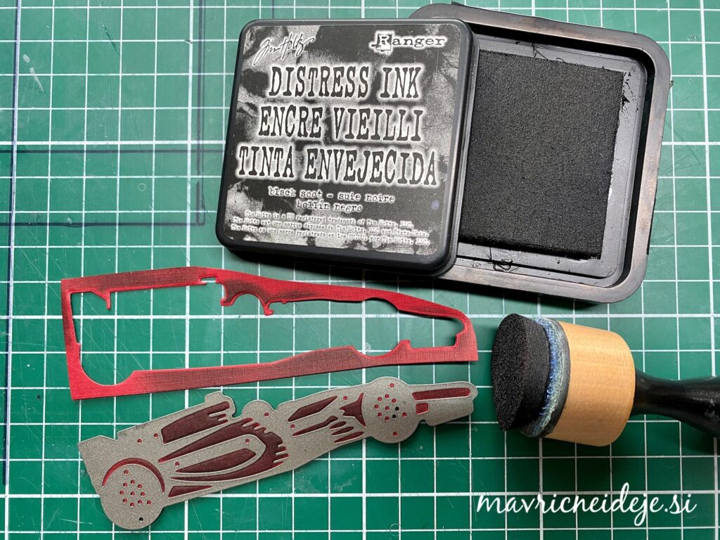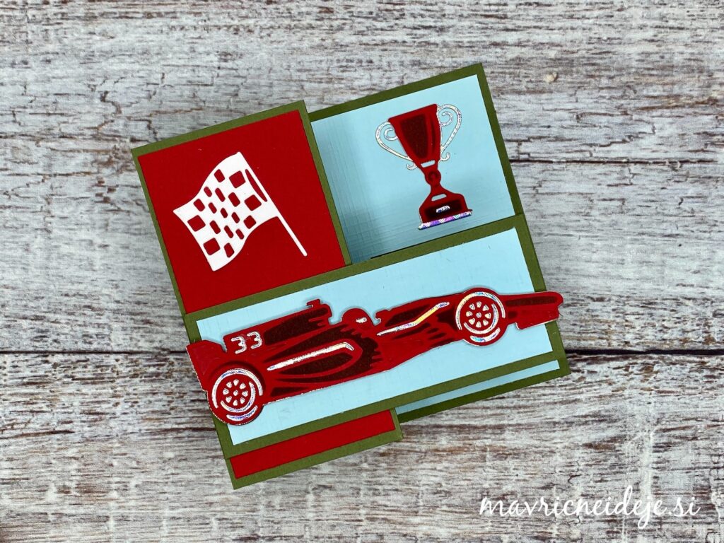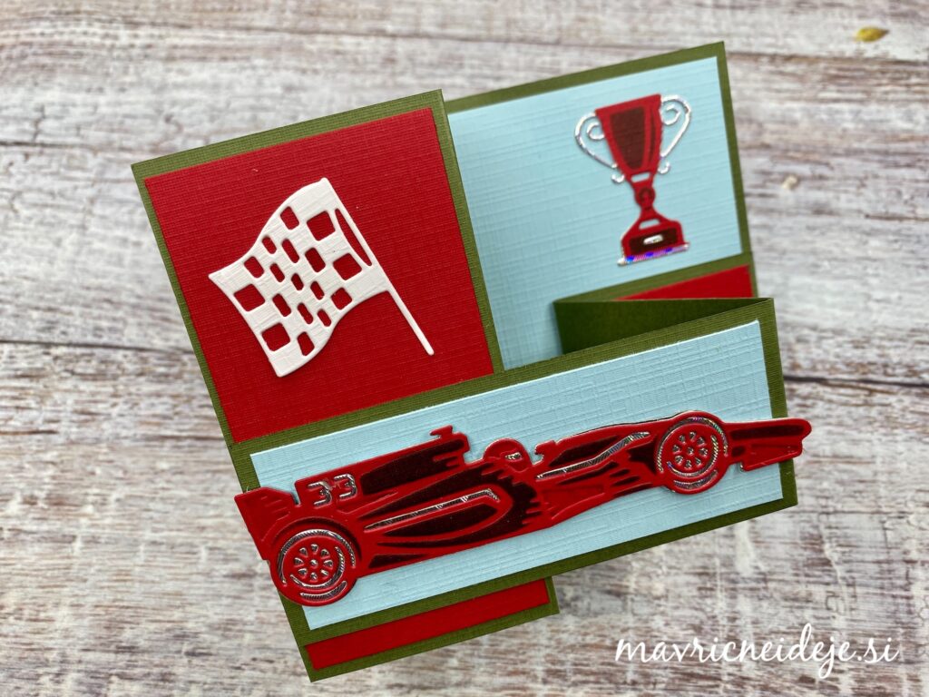 Iz rdečega papirja s teksturo sem z rezalno šablono izrezala motiv dirkalnika, nato vse še embosira na gumijasti podlagi. S črno blazinico sem kar preko rezalne šablone osenčila izrez.
