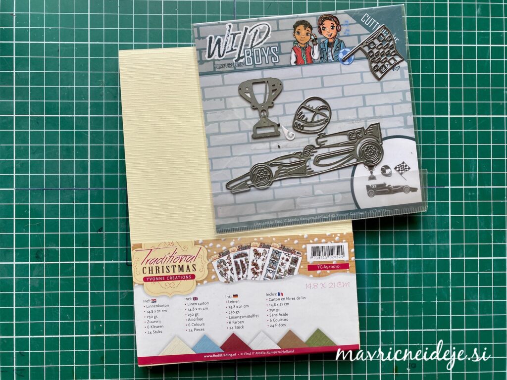 Za današnjo voščilnico sem izbrala Yvonne Creations -Wild Boys Cutting Die – Racing rezalno šablono ter Yvonne Creations – Papir s teksturo, Traditional Christmas. Papirji A5 Velikosti so barvno zelo lepo usklajeni, v setu je 24 listov v šestih barvah. Voščilnice je velika 10,5×10,5 cm z dvojnim “z” prepogibom.