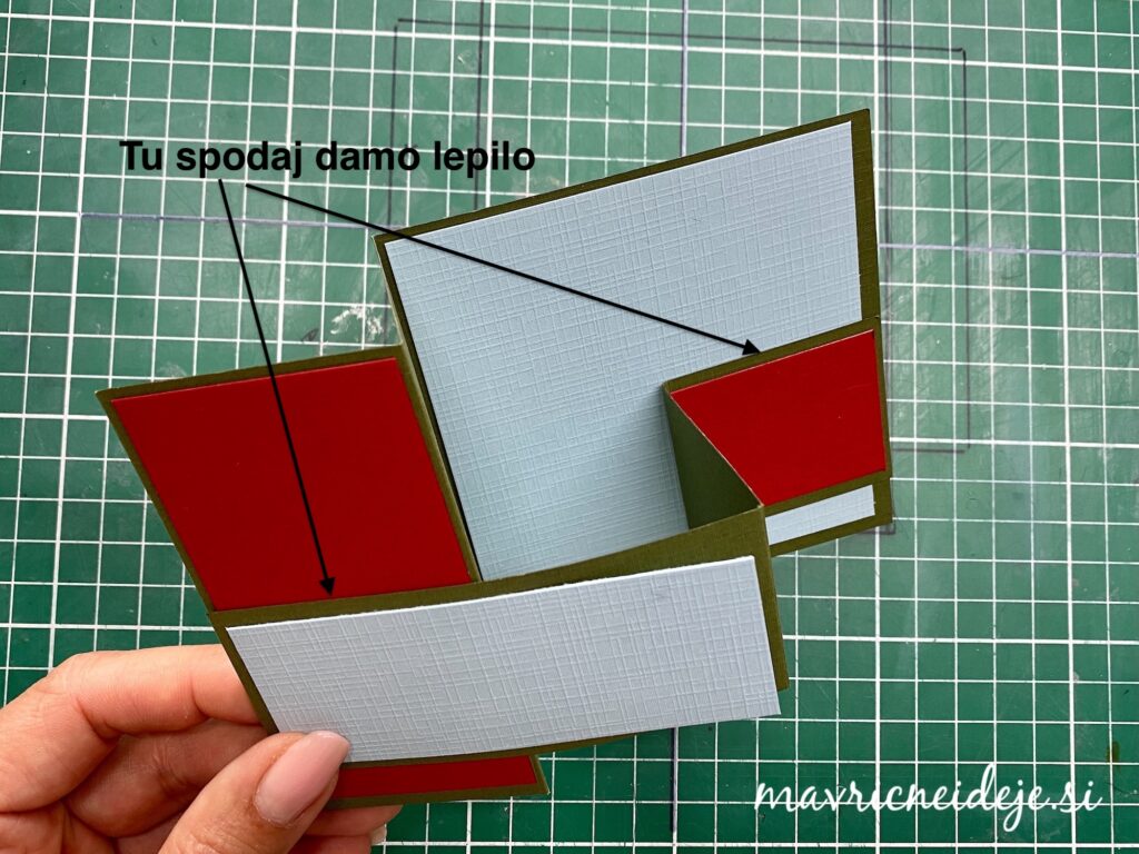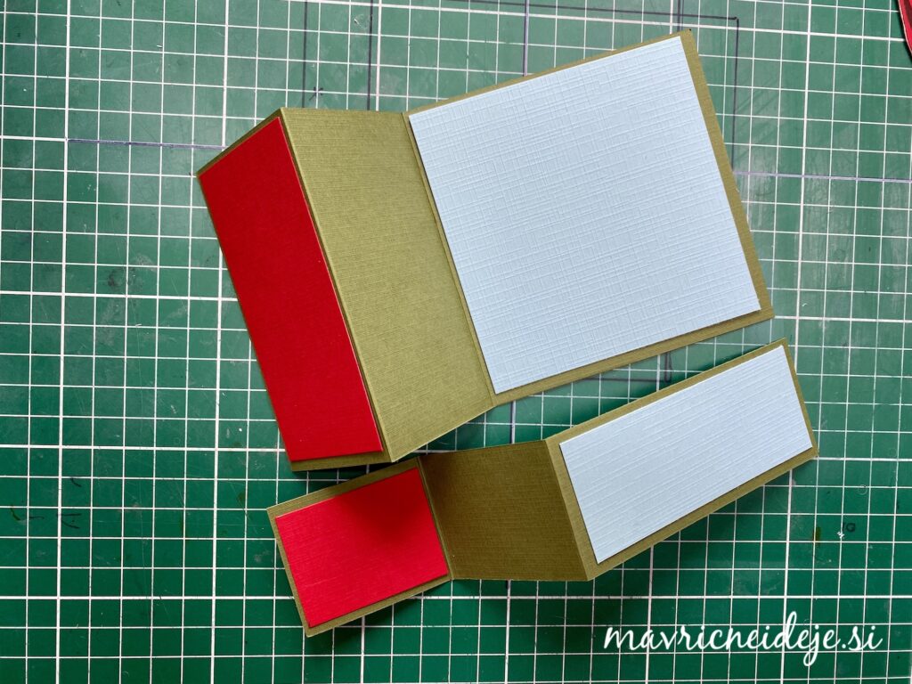 Na osnovo in odrezan del sem namestila barvne papirje in na odrezanem traku sem zamenjala smer prepogiba.