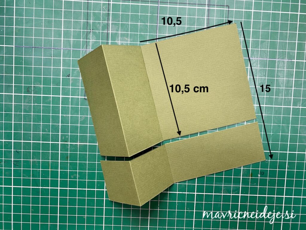 Zelen papir s teksturo sem prepognila na pol, da sem dobila običajno osnovo za voščilnico 10,5 x 15cm. Nato sem na prvi stranici na sredini naredila še en prepogib in papir zapognila navzven. Tako prepognjeno osnovo sem skrajšala za 4,5 cm tako je nastala kvadratna osnova.