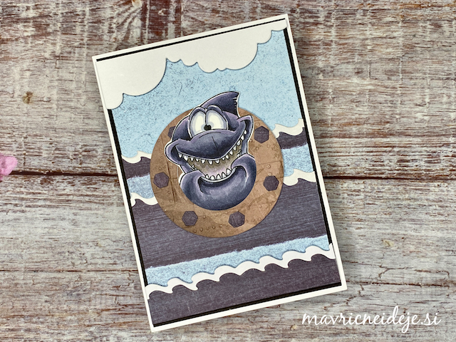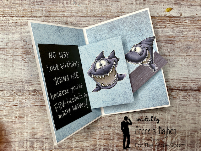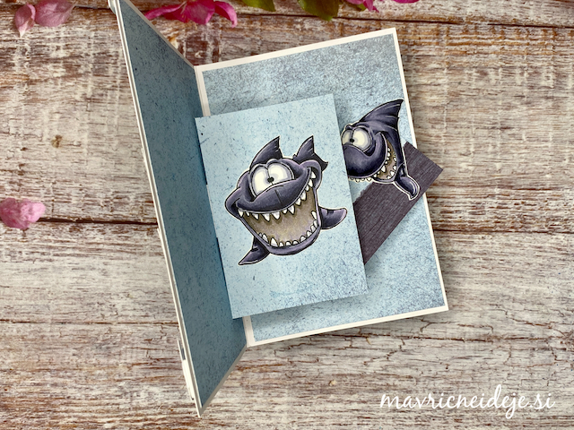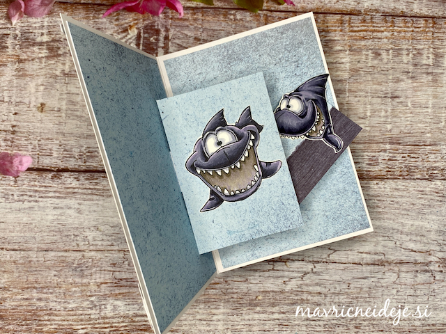 V marčevskem izzivu naj bodo na moških voščilnicah živali. Izbrala sem Whimsy Stamp Lookin’ Shark Štampiljko in jo pobarvala, ter prvo stran sestavila po vzoru enega od izdelkov na njihovi strani. V notranjosti pa se skriva dvojno presenečenje, saj gre za pop up voščilnico, pri kateri se en element dvigne, drugi pa premika od strani.